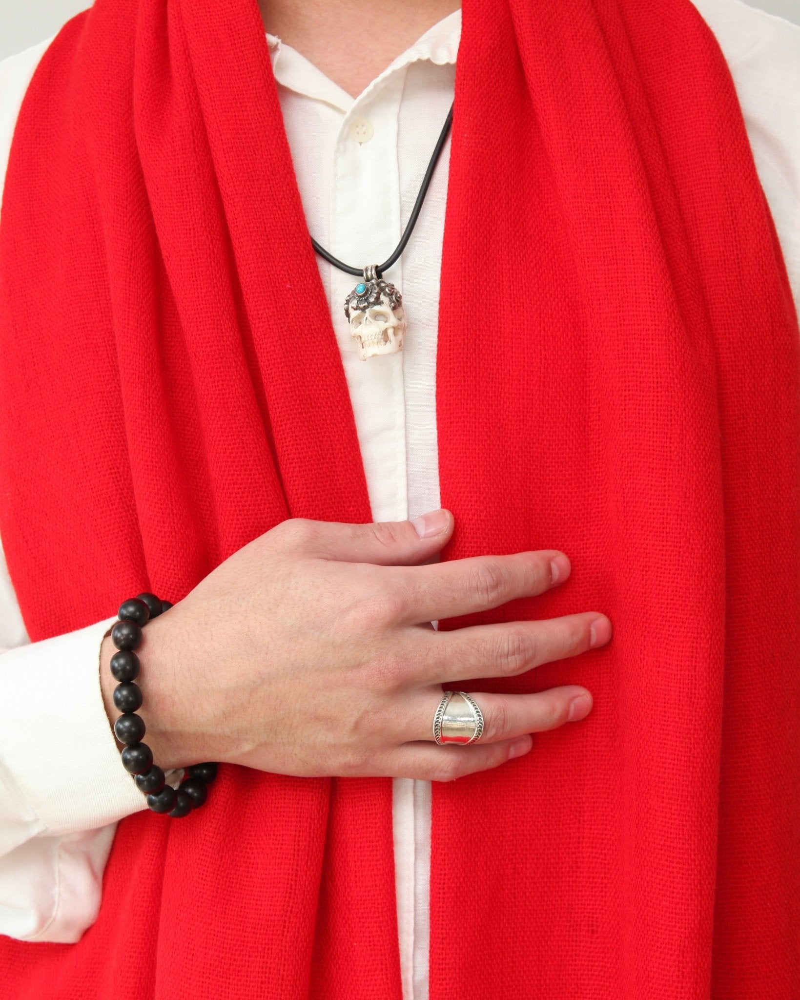 Himalaya-Schal • 100% Wolle • Rot mit blauen Streifen