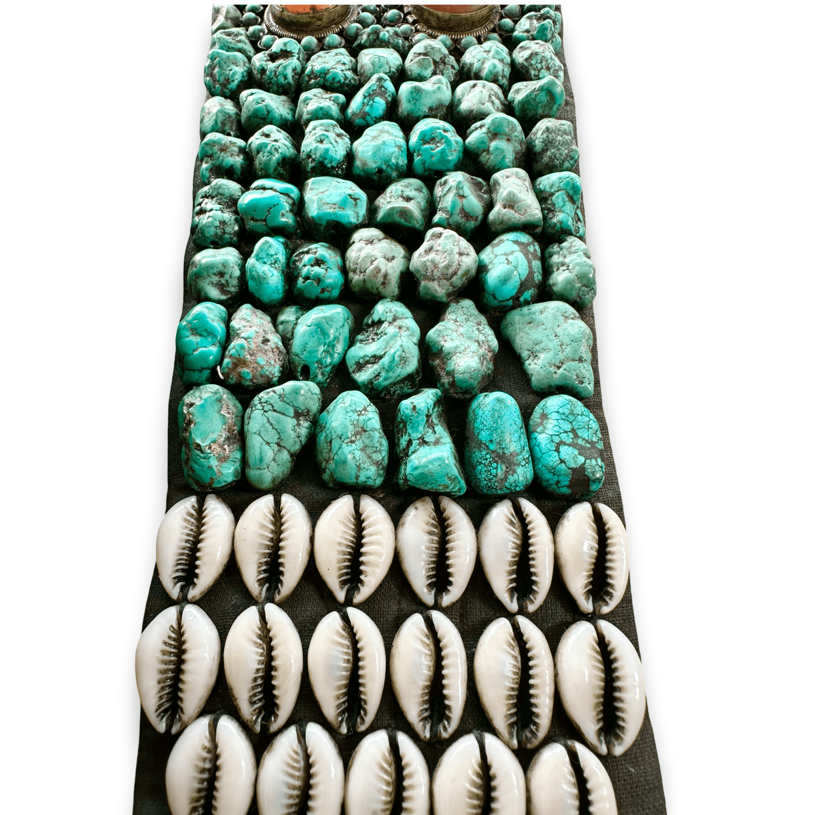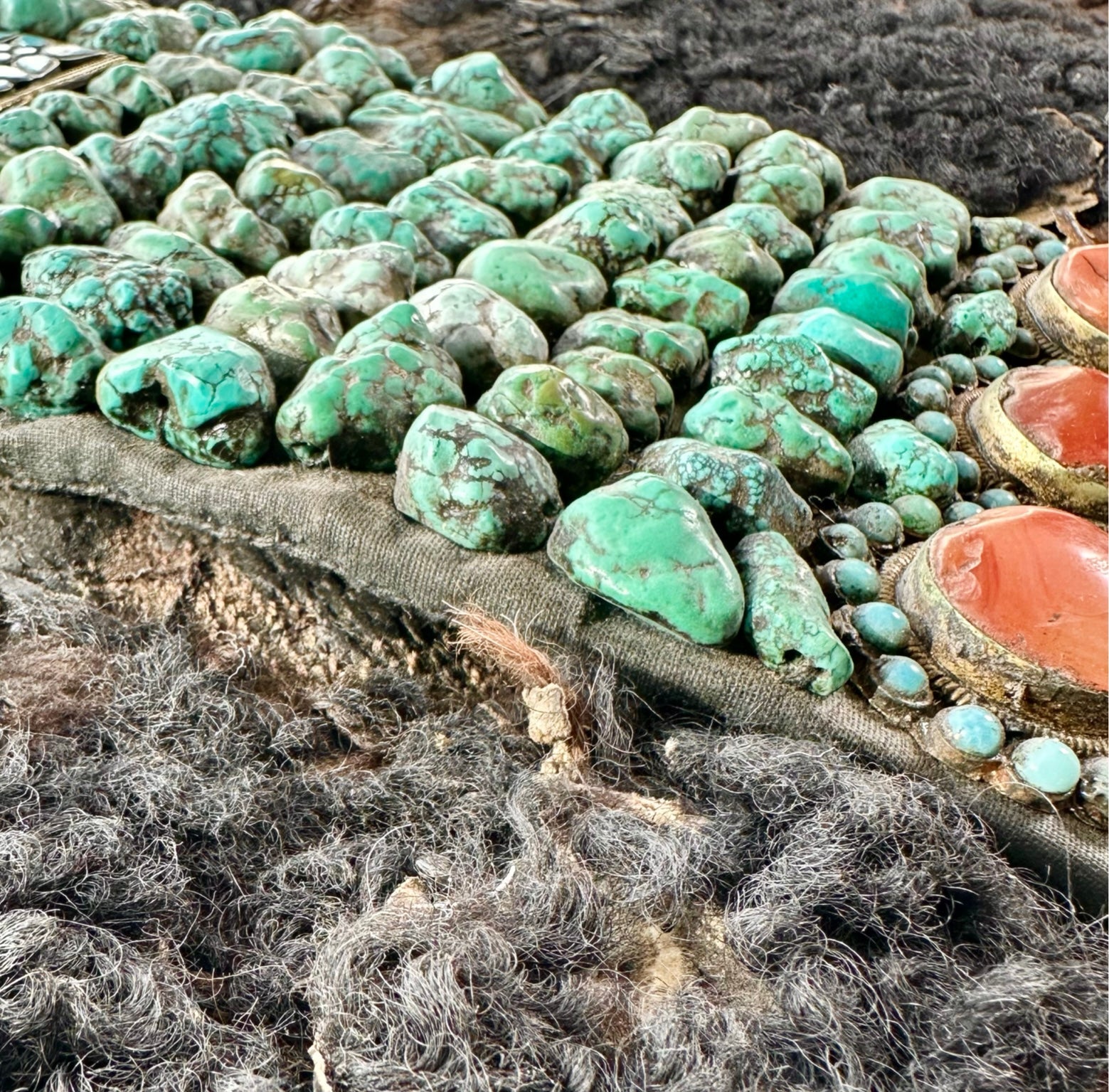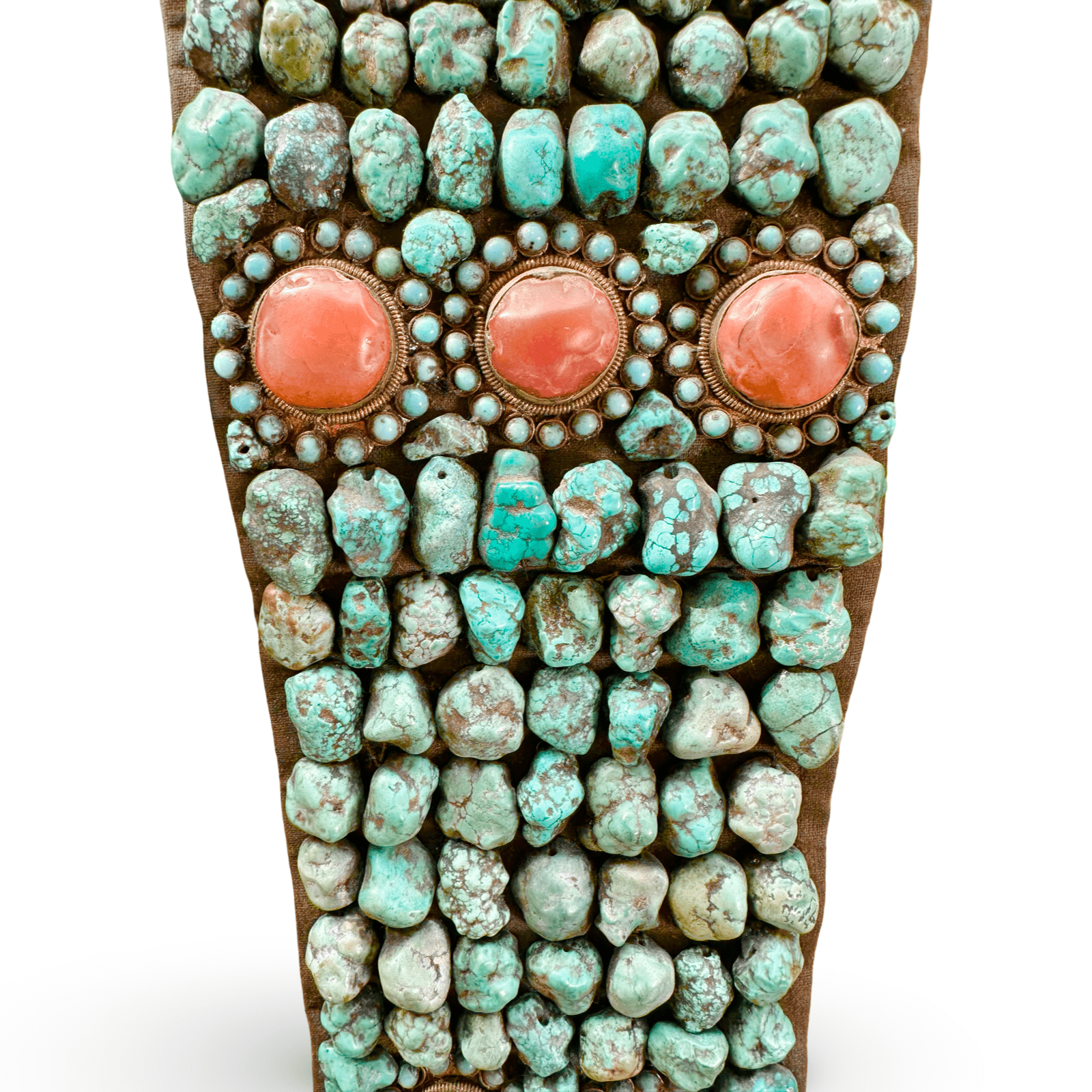 ལ་དྭགས་ནས་ཡོང་བའི་ པེ་རག་གི་མགོ་རྒྱན་ འདི་ནི་བལ་གྱི་རས་ཆ་བརྟན་པོ་ཞིག་གི་དཀྱིལ་གྱི་ཐིག་རིང་པོ་དང་མཐུག་པོ་ཞིག་ལས་གྲུབ་ཡོད། དེ་ལ་བཟོ་ལྟ་མི་འདྲ་བའི་ གཡུ་རྡོ་ མང་པོས་མཐུག་པོ་བཀབ་ཡོད། དེས་ཤུགས་ལྡན་དང་སྲུང་སྐྱོབ་ཀྱི་སྤྱིར་བཏང་གི་ཚོར་སྣང་ཞིག་བསྐྲུན་ཡོད། གོང་མའི་སྡེ་ཚན་ནང་ ལ་རྡོ་རིང་སྒོང་དབྱིབས་ཆེན་པོ་གསུམ་ བཀོད་ཡོད། དེ་དག་སྲོལ་རྒྱུན་གྱི་དངུལ་གྱི་ལས་ཀའི་ནང་དུ་སྐུད་པ་མཉེན་པོ་དང་རྡུལ་ཕྲན་གྱི་མཛེས་རྒྱན་བཀོད་ཡོད།