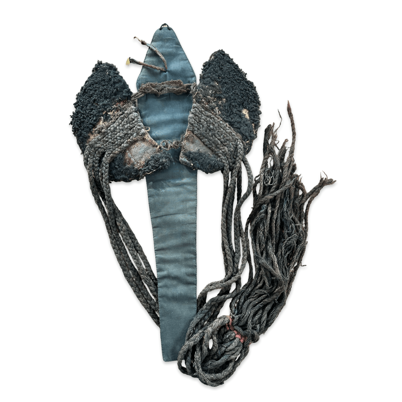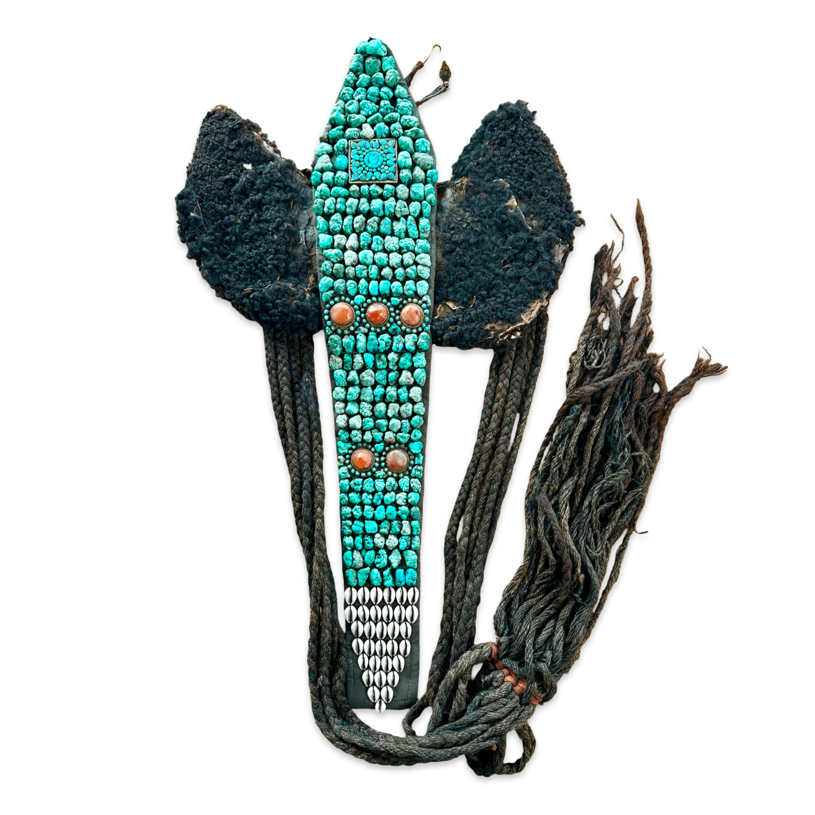 མཇིང་པ་ནག་པོ་དང་མཐུག་པོ་ལས་བཟོས་པའི་"ལུག་ཕྲུག་གི་རྣ་བ་" ཆེན་པོ་གཉིས་དབུས་ཀྱི་ཐིག་རིས་ཀྱི་ཕྱོགས་གཉིས་སུ་བཙེམས་ཡོད། མཐོ་སྒང་ནས་ གཡག་གི་སྐྲ་ནག་པོ་བཏང་བའི་སྐྲ་ རིང་པོ་འགའ་ཤས་བཀལ་ནས་མགོ་རྒྱན་གྱི་སྤྱིའི་རིང་ཚད་ལ་མངོན་གསལ་དོད་པོས་ཆེ་རུ་གཏོང་གི་ཡོད།
