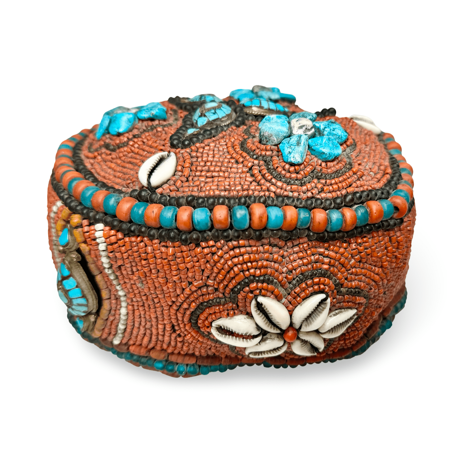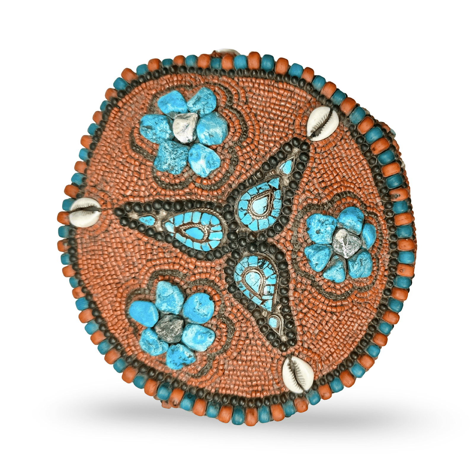 བོད་ཀྱི་མཛད་སྒོའི་ཞྭ་མོ་འདི་དུས་རབས་༢༠པའི་ཕྱེད་ཀའི་ནང་དུ་བཟོས་པ་འདྲ། དེ་ལ་ཚོན་མདོག་ཅན་གྱི་ཕྲེང་བ་དང་། རྡོ་དམར་པོ། དེ་བཞིན་ཀོ་རི་ཡི་ཤུན་གྱིས་མཐུག་པོ་བཀབ་ཡོད། ཕྲེང་བའི་དམར་པོ་དང་རྒྱ་མུག་དྲོ་བོ་དེས་མེ་ཏོག་གི་རི་མོ་རྙོག་འཛིང་ཅན་ལ་རྒྱབ་ལྗོངས་ཕྲ་མོ་ཞིག་བསྐྲུན་ཡོད། ལྕགས་རིགས་དཀར་པོ་དང་གཡུ་མདོག་ལས་བཟོས་པའི་དབུས་ཀྱི་རྒྱན་ཆ་དེ་དག་དམིགས་བསལ་གྱི་ཡིད་འཕྲོག་པ་ཞིག་ཡིན། དེ་དག་གི་བཟོ་བཀོད་ཀྱིས་ཨ་ཀོར་གྱི་ཁྱད་ཆོས་ལྡན་པའི་རྒྱན་ཆ་དྲན་སྐུལ་བྱེད་ཀྱི་ཡོད། ཞྭ་མོའི་སྟེང་དུ་རས་ནག་པོ་ཞིག་བཏགས་ཡོད།