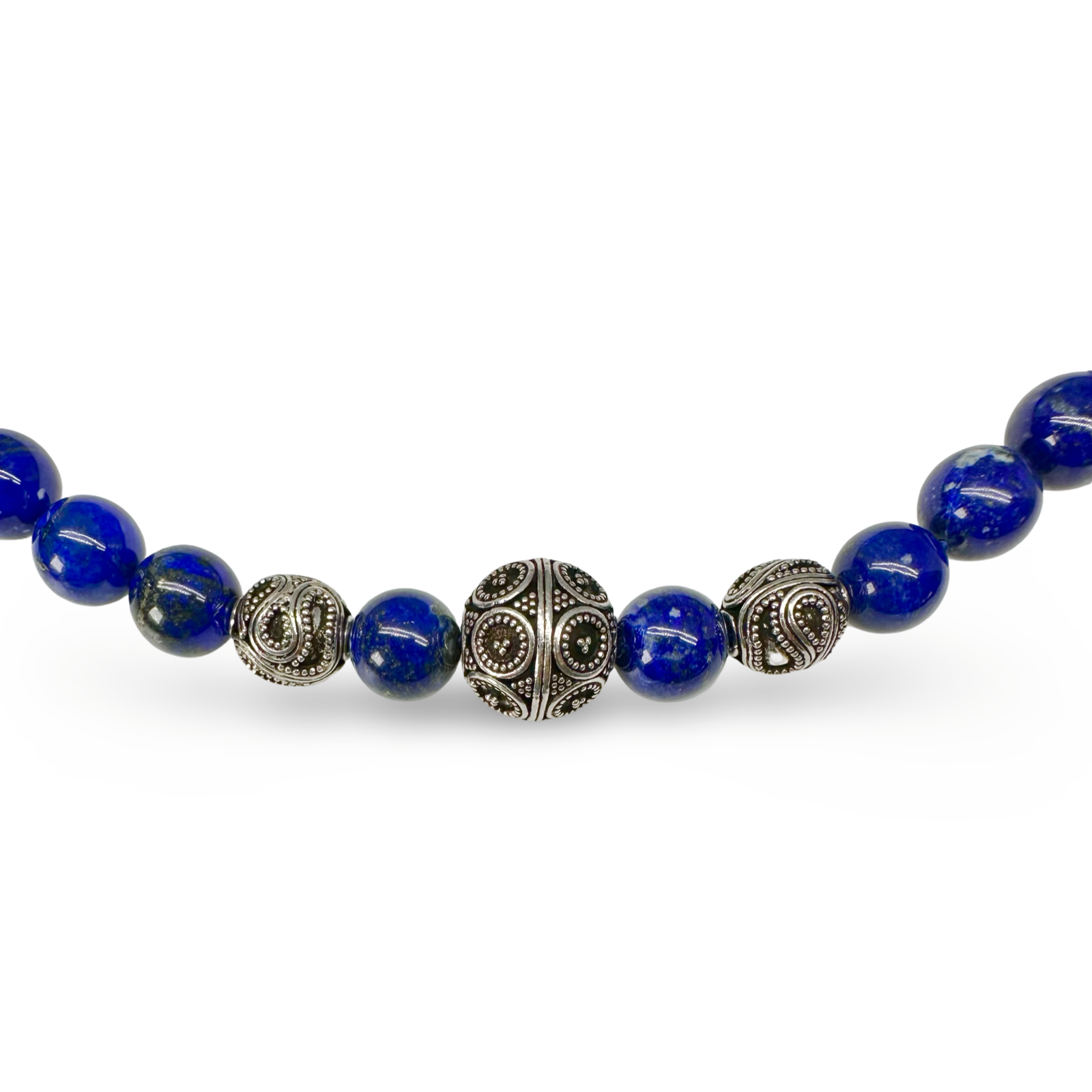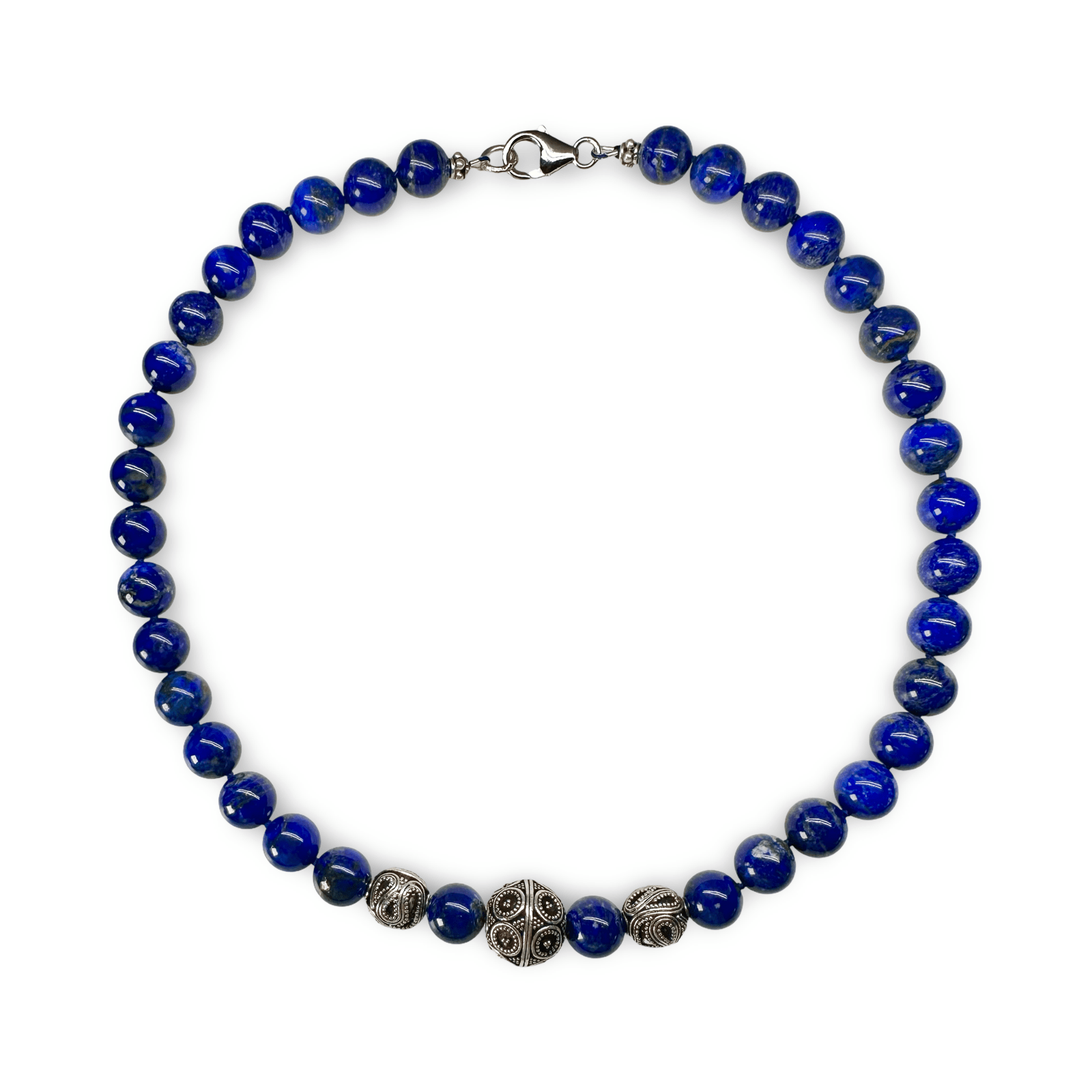 མཐོ་ཚད་སྨི་10ཡོད་པའི་ལ་པི་སི་ལ་ཟུ་ལི་ཕྲེང་བ་དང་སྲོལ་རྒྱུན་གྱི་ལག་བཟོས་དངུལ་གྱི་ཕྲེང་བ་ལས་བཟོས་པའི་མཛེས་སྡུག་ལྡན་པའི་སྐེ་ཕྲེང་ཞིག མགུལ་རྒྱན་དེ་དངུལ་གྱི་དཔྱིད་ཀའི་སྦྲེལ་མཐུད་ཆེན་པོ་ཞིག་གིས་བསྡམས་ནས་མཐའ་འཁོར་གྱི་རིང་ཚད་ལ་སྨི་46ཡོད། དེ་ནི་ཛུ་རིག་གྲོང་ཁྱེར་གྱི་བོད་ཀྱི་བཟོ་གྲྭ་ཁང་དུ་ལག་བཟོས་བྱས་པ་རེད།