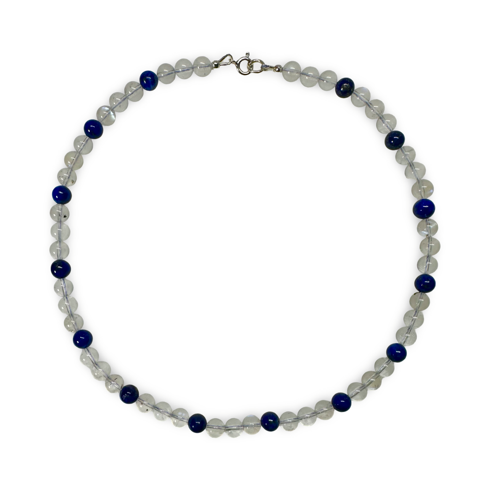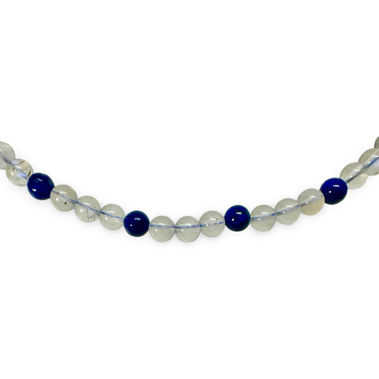 Halskette aus Mondstein- und Lapis Lazuli-Perlen mit einem Durchmesser von 7 mm. Sie hat einen Umfang von 40 cm und wird mit einem Federverschluss aus Silber geöffnet. Die Kette wird im Atelier Tibet in Zürich handgefertigt.