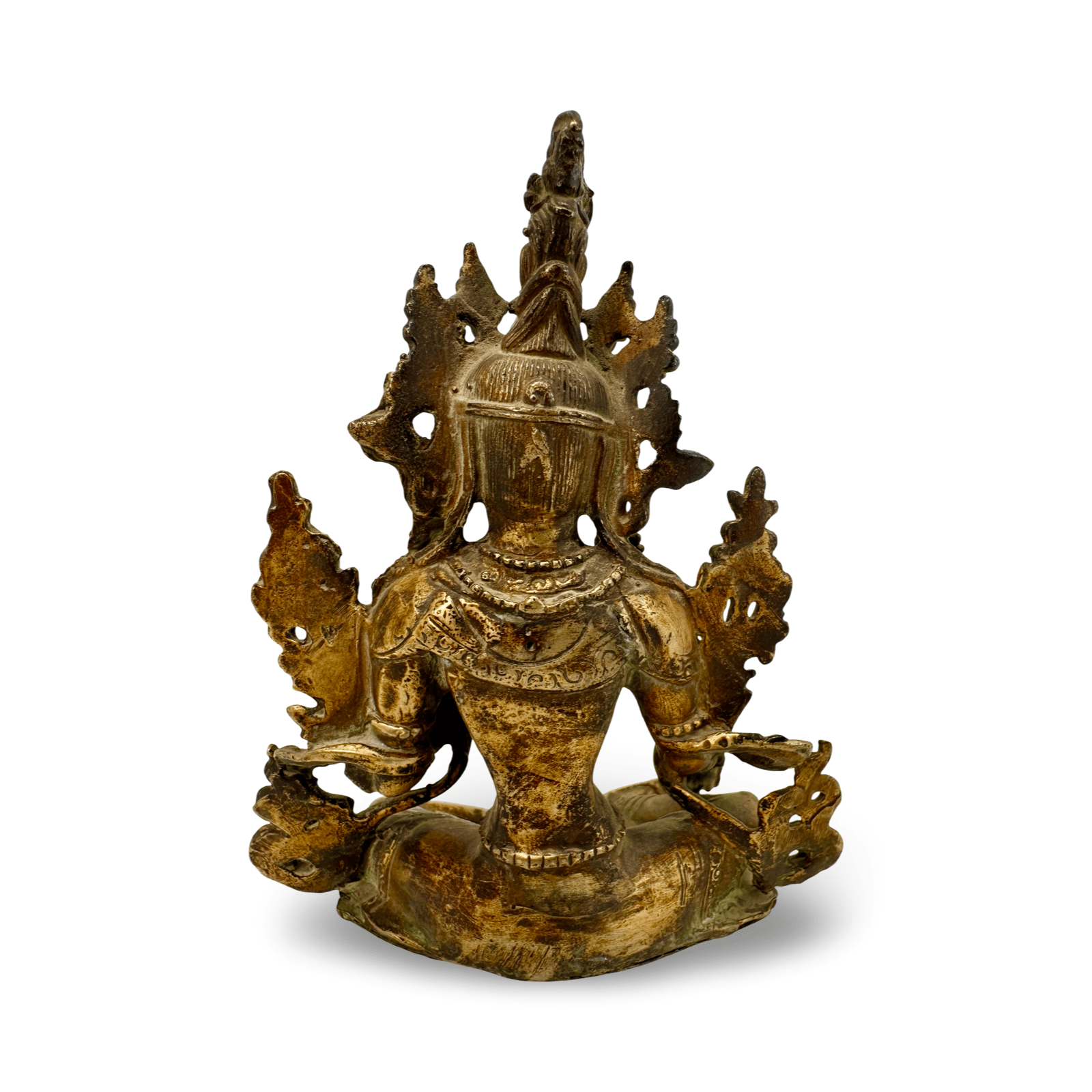 Die fein ausgearbeitete Krone, die fliessenden Gewandfalten und die ornamentalen Details zeugen von klassischer nepalesischer Metallkunst; die Vergoldung ist bewusst unregelmäßig und verleiht der Statue Tiefe und Charakter.