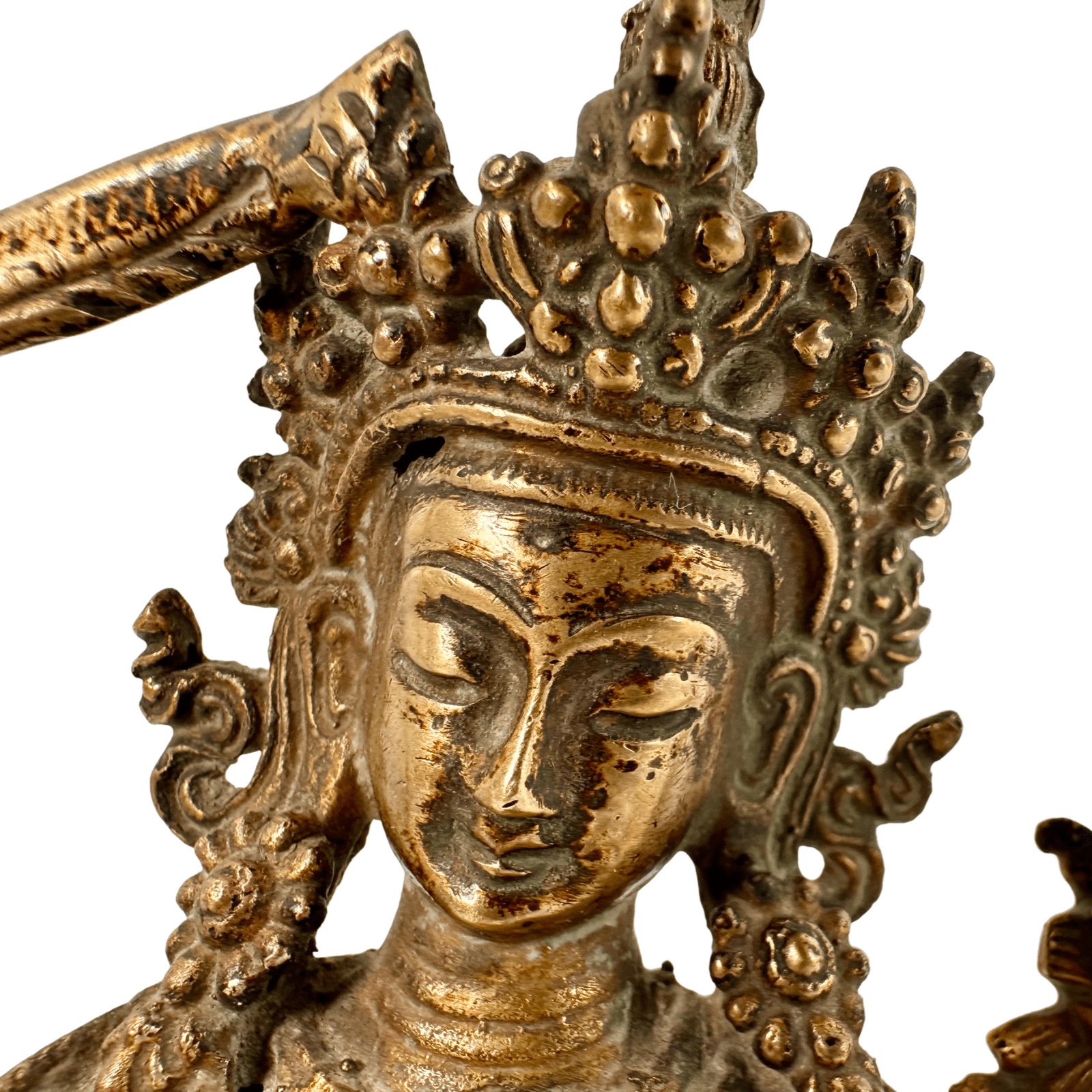 Manjushri ist in meditativer Sitzhaltung dargestellt. In der erhobenen rechten Hand hält er das Flammenschwert der Weisheit, mit dem Unwissenheit und geistige Verblendung durchtrennt werden. In der linken Hand trägt er die Lotusblume, auf der traditionell ein Weisheitstext ruht – Sinnbild für Erkenntnis und Einsicht. Die feine Ausarbeitung von Krone, Schmuck und Gewandfalten zeugt von sorgfältiger Handwerkskunst.