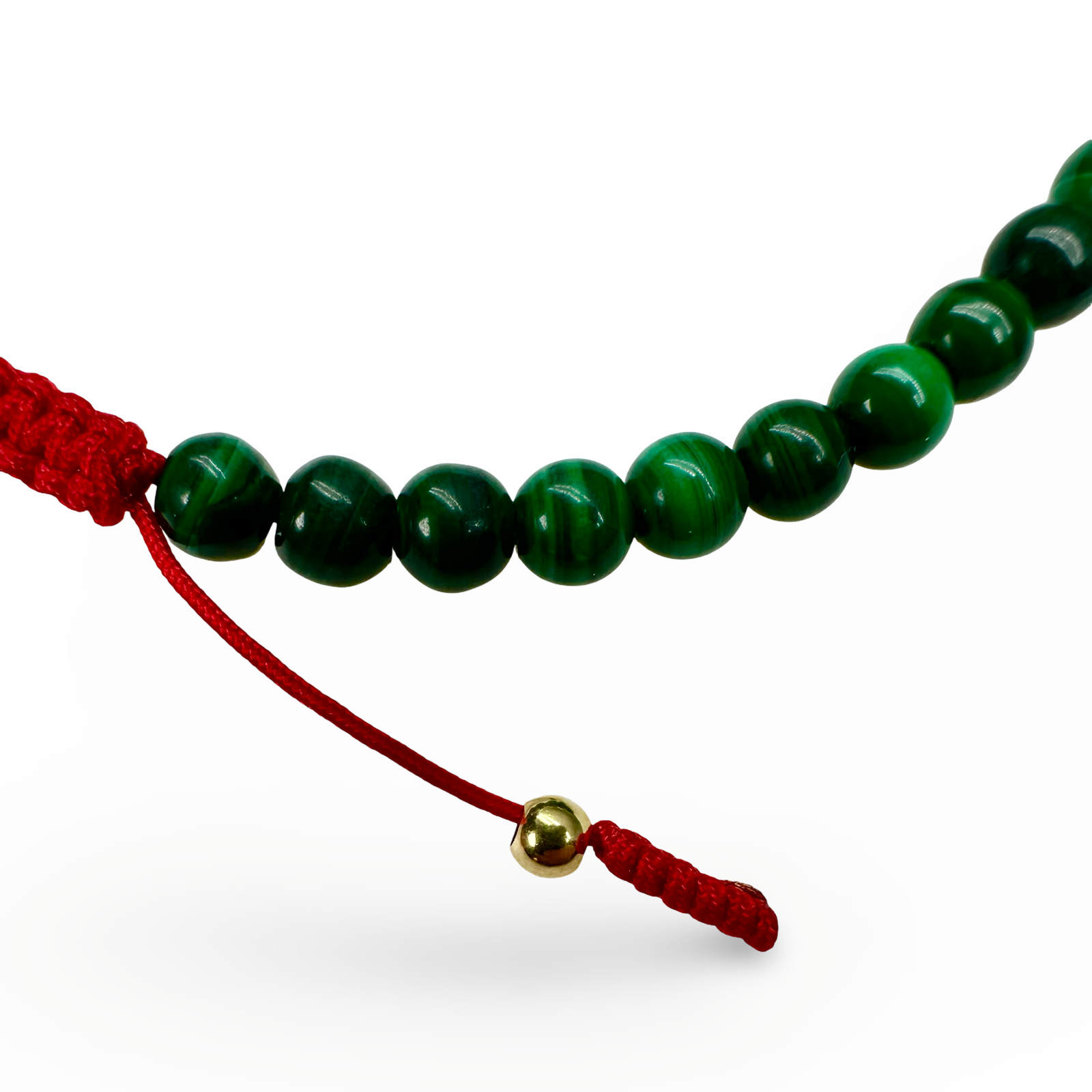 Mala-Armband mit Malachit-Perlen mit einem fein marmorierten Muster mit einem Durchmesser von 5 mm, dazwischen vergoldete, scheibenförmige Silberperlen. Das Armband ist in mehreren Grössen erhältlich und kann mit zwei roten Kordeln, an denen je eine vergoldete Silber-Perle angebracht ist, geöffnet werden. Handgemacht in Zürich im Atelier Tibet.