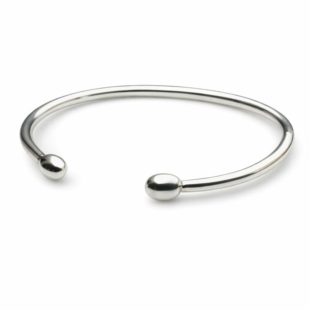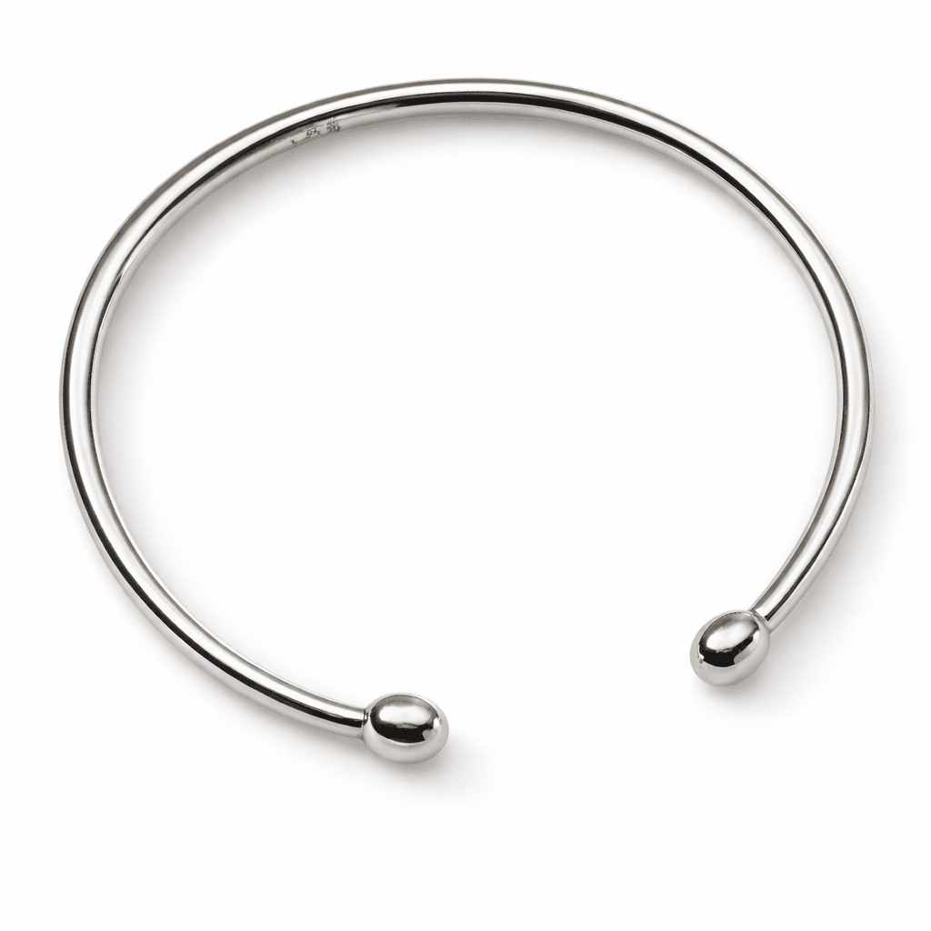 Elegante und zugleich schlichte Armspange aus Silber, die sich an den Enden verjüngt und in zwei Kugeln endet. Wir lassen sie in einer traditionsreichen Werkstatt in Nepal von Hand schmieden.