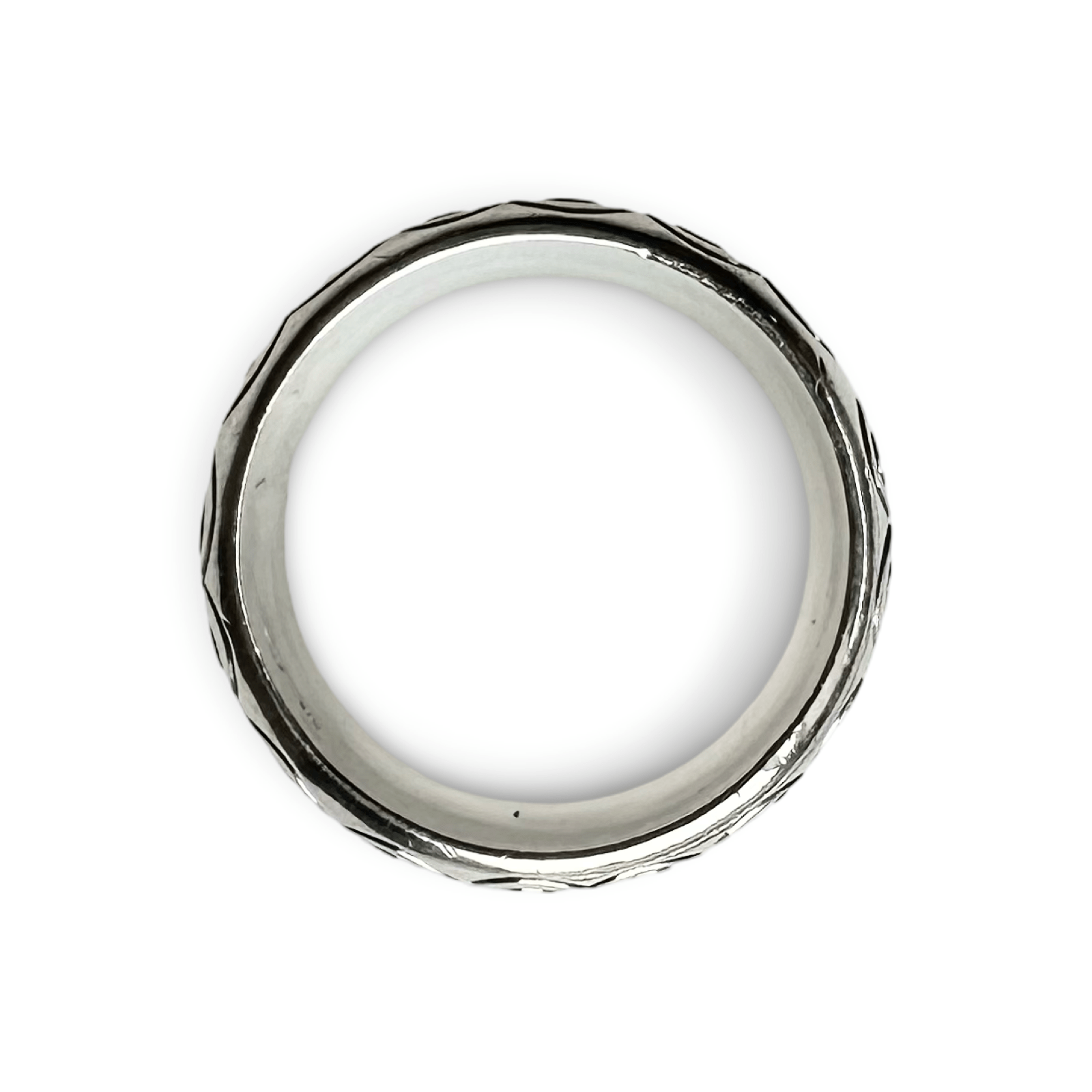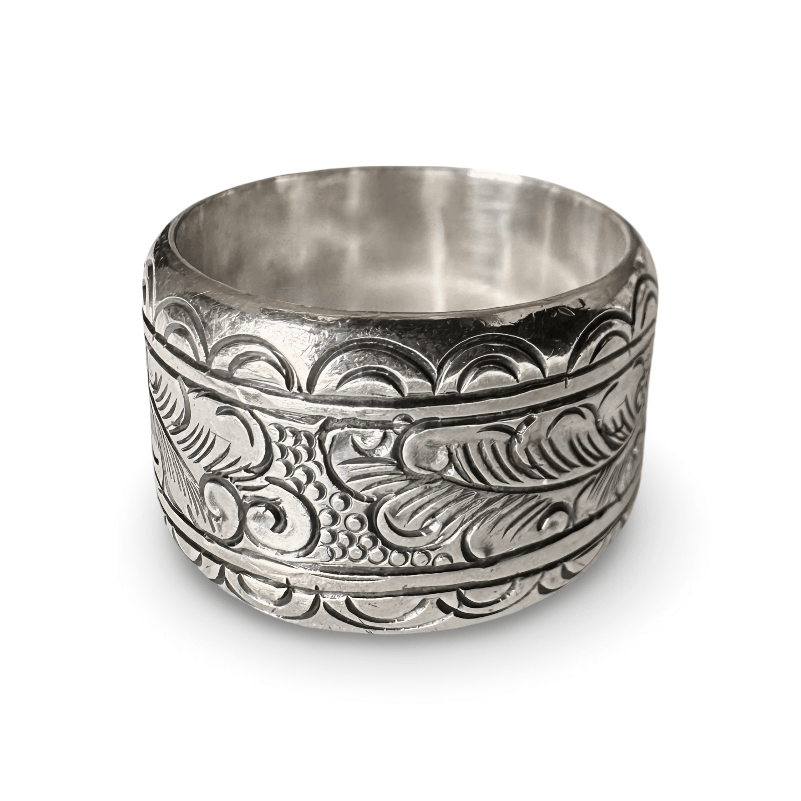 Dieser eindrucksvolle Silberring aus unserer Heritage-Collection ist rundum mit einem tibetischen Pflanzenmotiv ziseliert. Die feinen Linien und geschwungenen Muster zeigen stilisierte Blätter, Ranken und florale Ornamente.