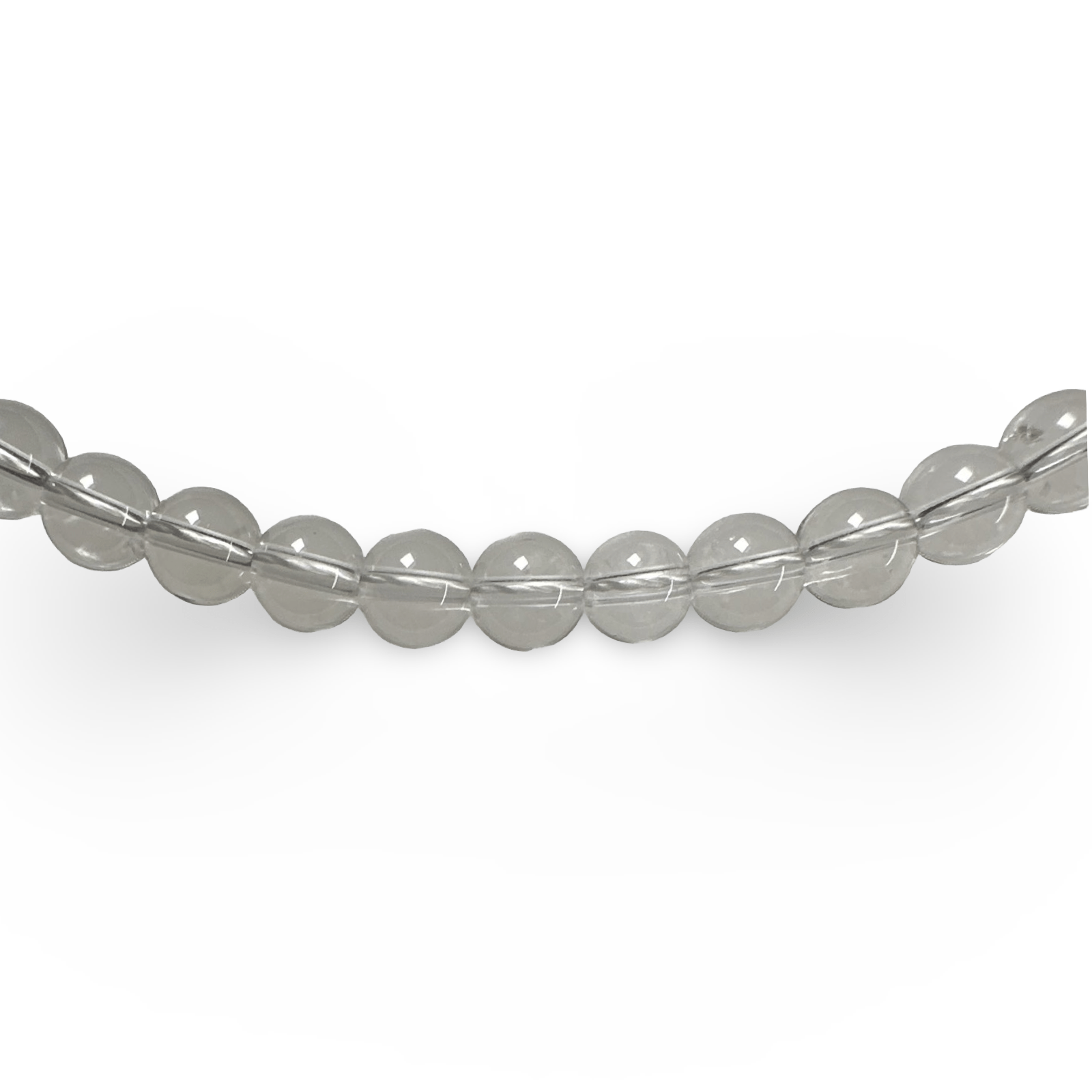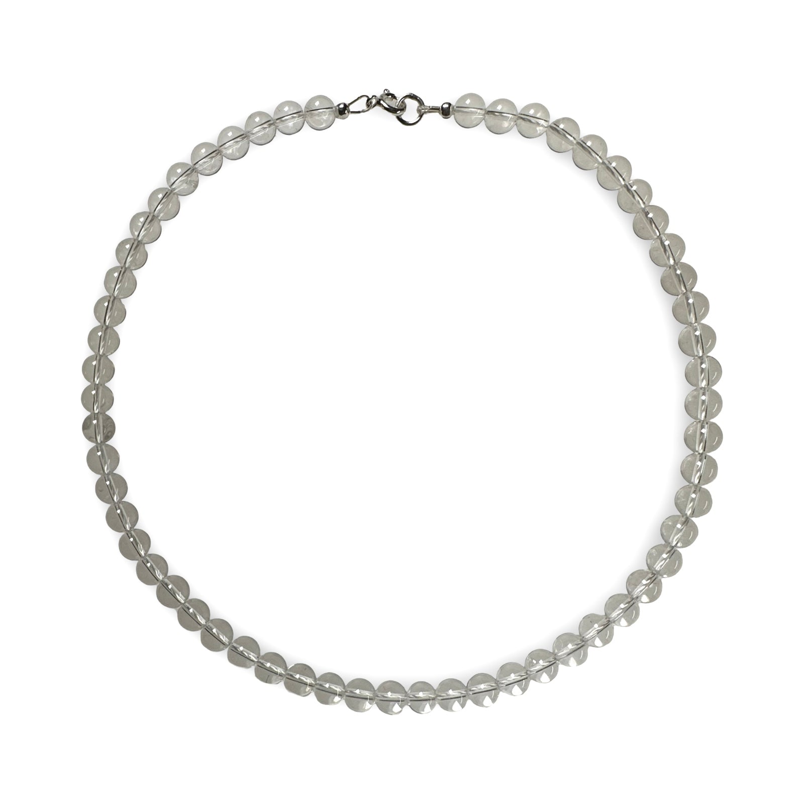 Kurz getragene Halskette mit transparenten, glänzenden Bergkristall-Perlen mit einem Durchmesser von 7 mm. Die Kette ist 38 cm lang und wird mit einem Federverschluss aus Silber geöffnet. Handgemacht in Zürich im Atelier Tibet.
