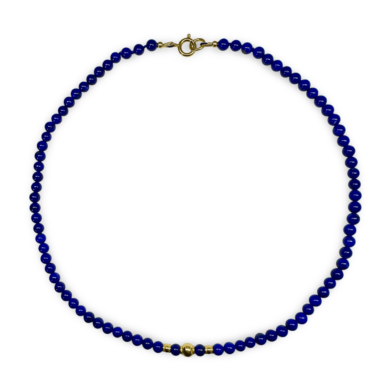 Elegante und zierliche Halskette mit tiefblauen Lapis Lazuli-Perlen mit einem Durchmesser von 5 mm und drei vergoldeten Silberperlen. Der Umfang der Kette beträgt 42 cm. Sie wird im Atelier Tibet in Zürich gefertigt.