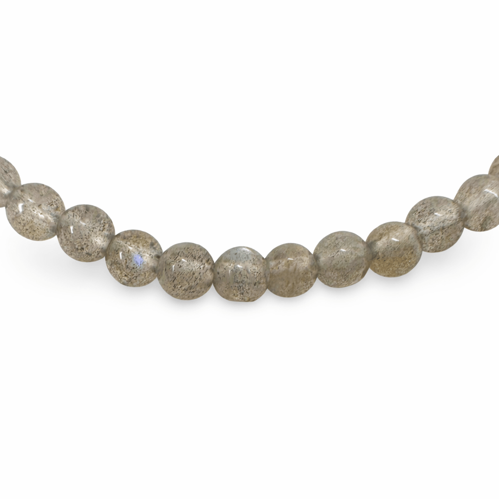 Elastisches Mala-Armband mit hochwertigen geschliffenen Labradorit-Perlen (Ø 4 mm), die im Licht in verschiedenen Grau-, Blau- und Grüntönen schimmern. Der Umfang beträgt ca. 16.5 cm. Das Armband wird für uns in Indien hergestellt.