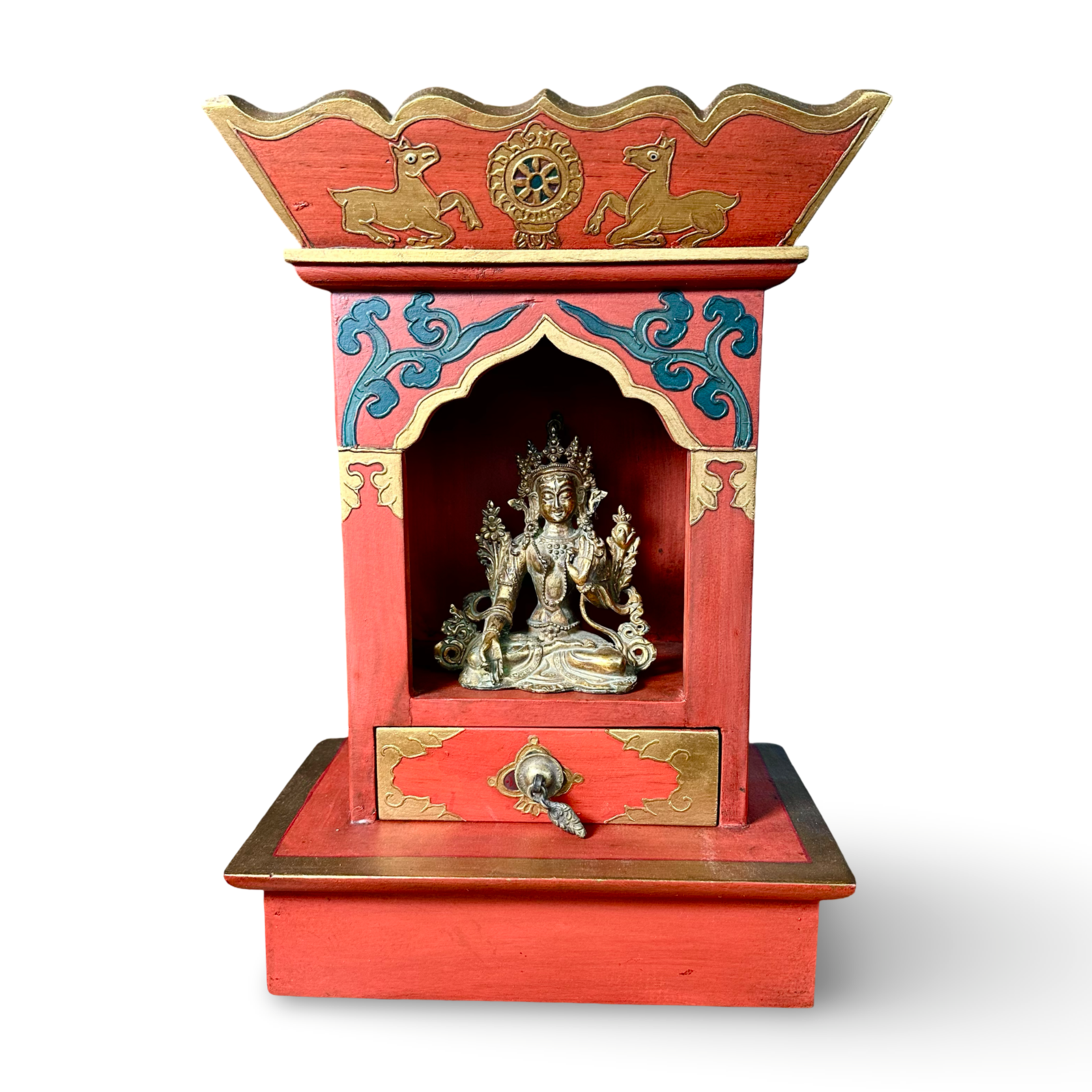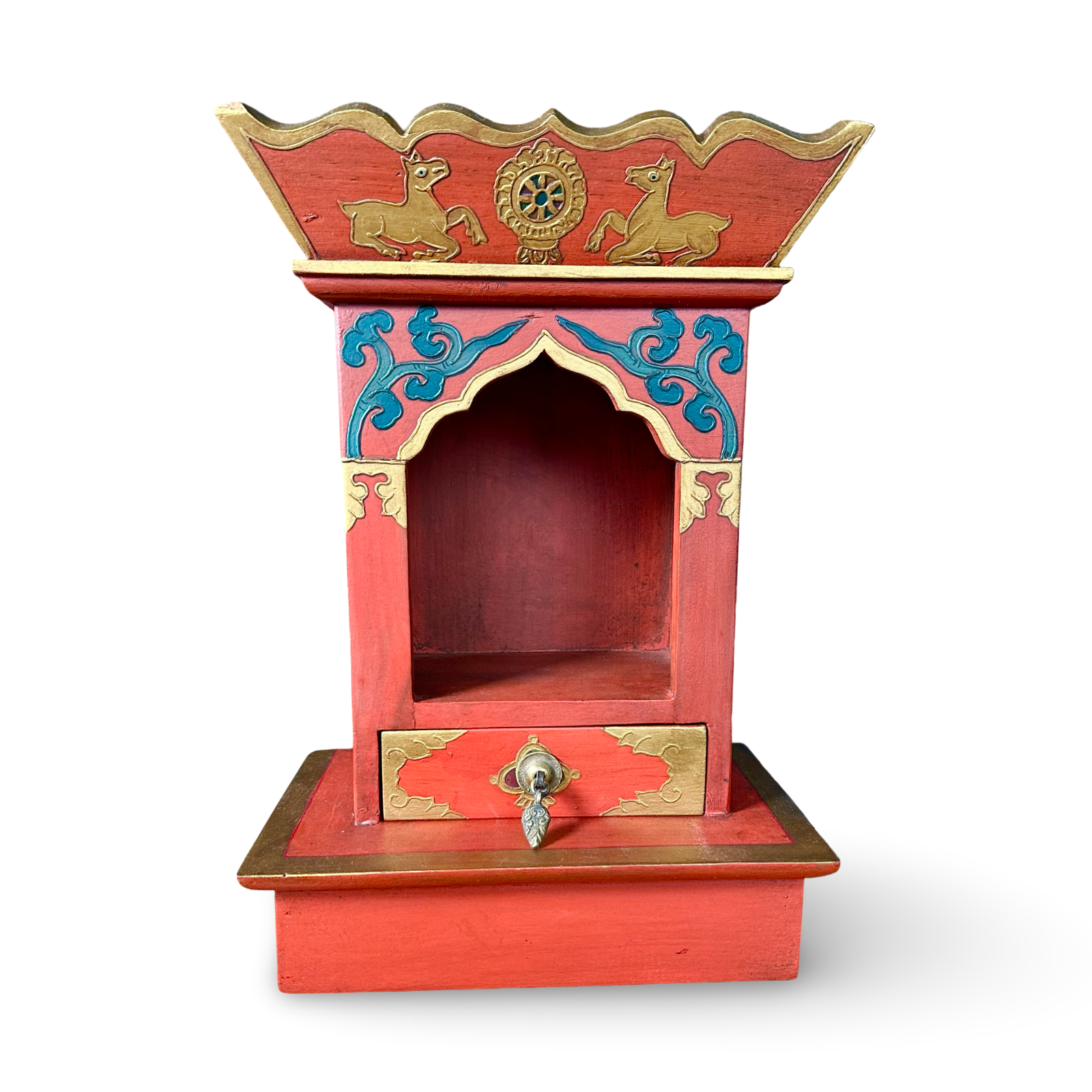 Die Dachzone ist profiliert und mit vergoldeten Kanten versehen. Seitliche und frontale Ornamente sind dekorativ ausgearbeitet und bemalt. Unterhalb der Nische befindet sich eine kleine Schublade mit Metallgriff, geeignet zur Aufbewahrung von Räucherwerk, Gebetszetteln oder kleinen Ritualgegenständen.