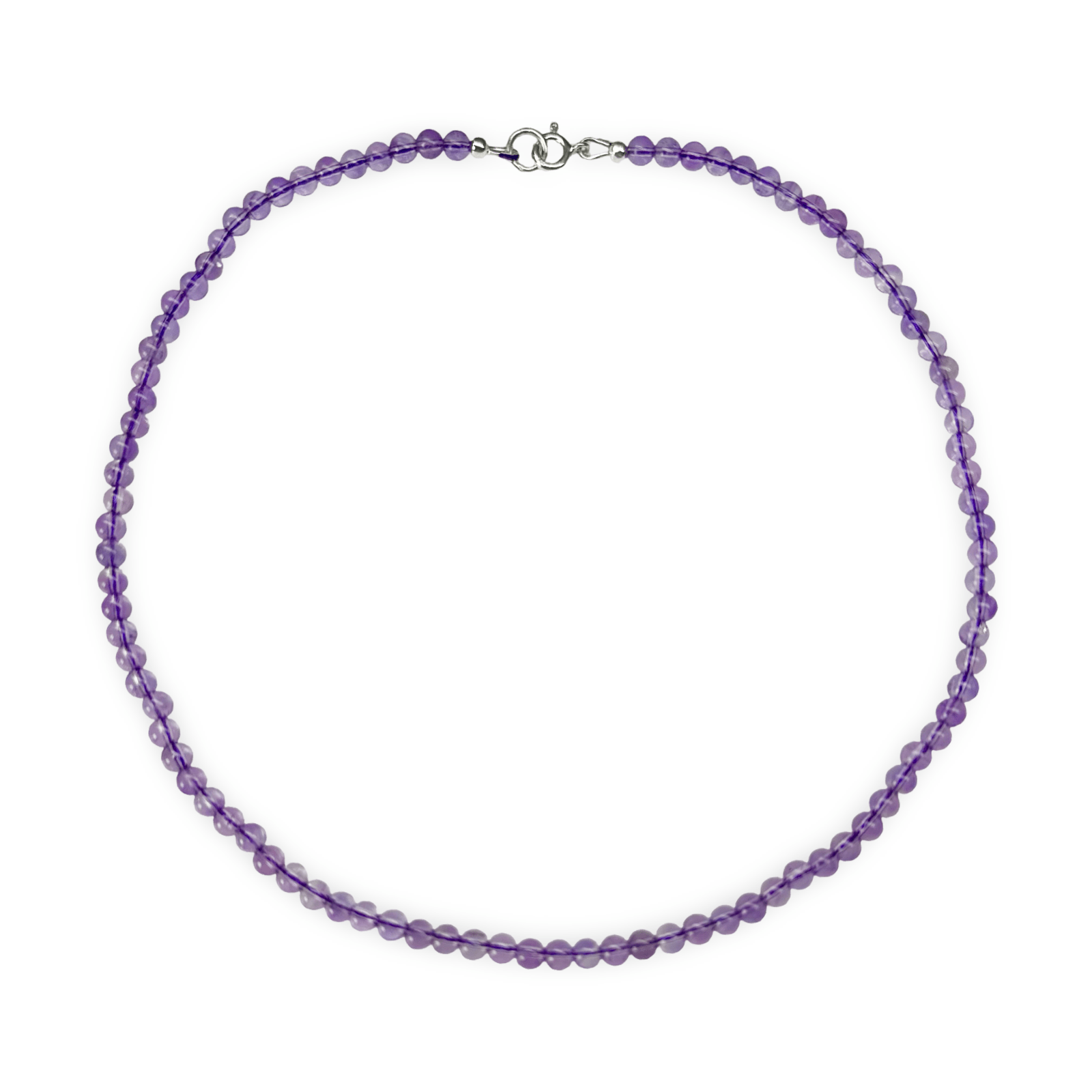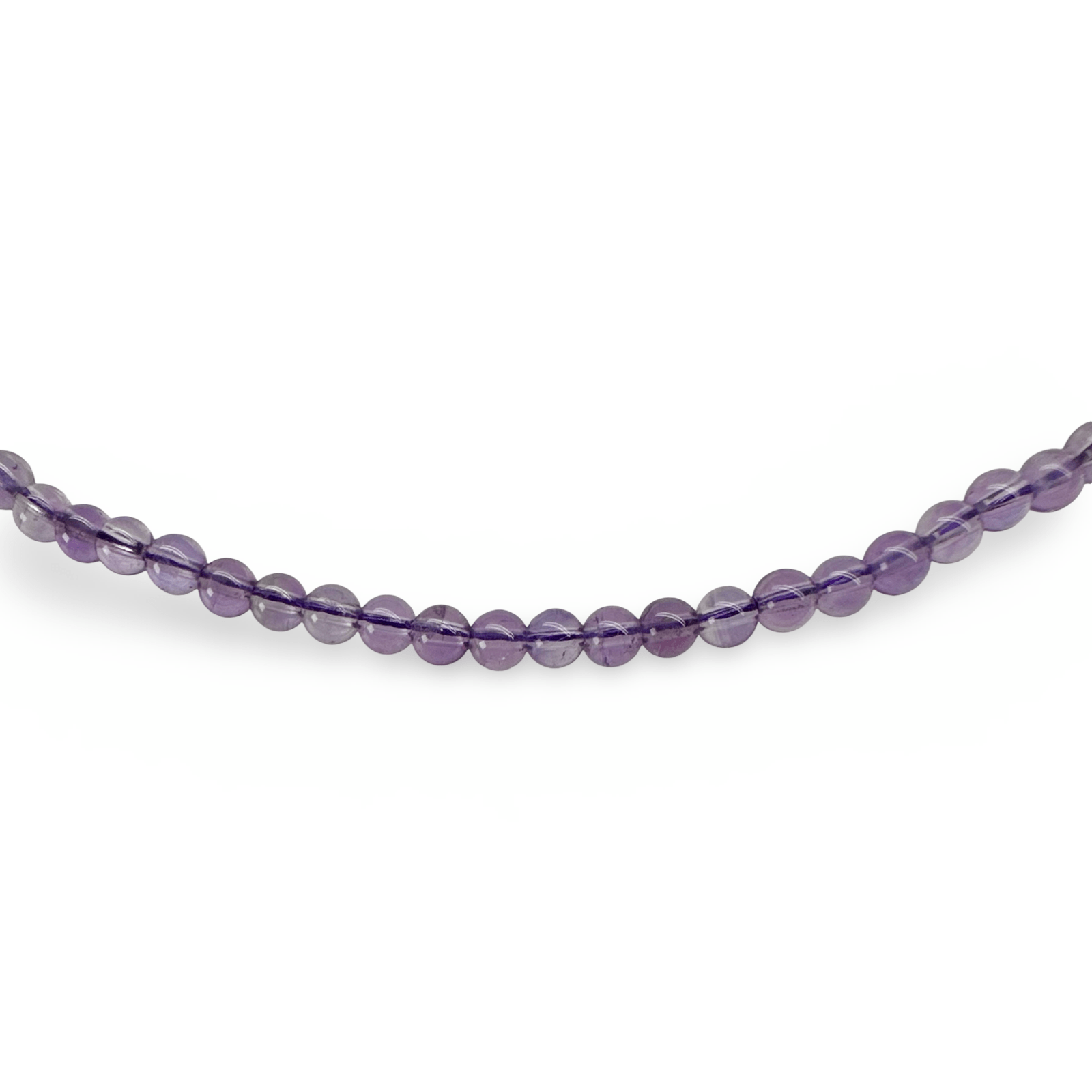 Halskette aus violetten, halbtransparenten Amethyst-Perlen mit einem Durchmesser von ca. 4 mm. Die Kette hat einen Umfang von 39 cm und lässt sich mit einem Federverschluss aus Silber öffnen. Sie wird im Atelier Tibet in Zürich handgefertigt.