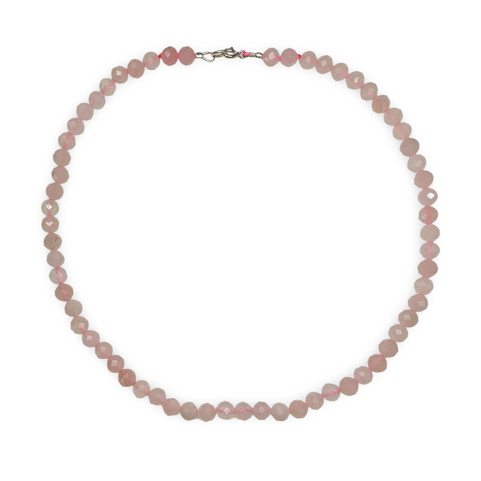 Halskette aus facettierten Rosenquarz-Perlen mit einem Durchmesser von 6 mm, die an einer pinken Schnur aufgezogen sind, welche zwischen den Perlen sichtbar wird. Die Kette wird mit einem Federverschluss aus Silber geschlossen und misst 40 cm im Umfang. Handgefertigt im Atelier Tibet in Zürich.