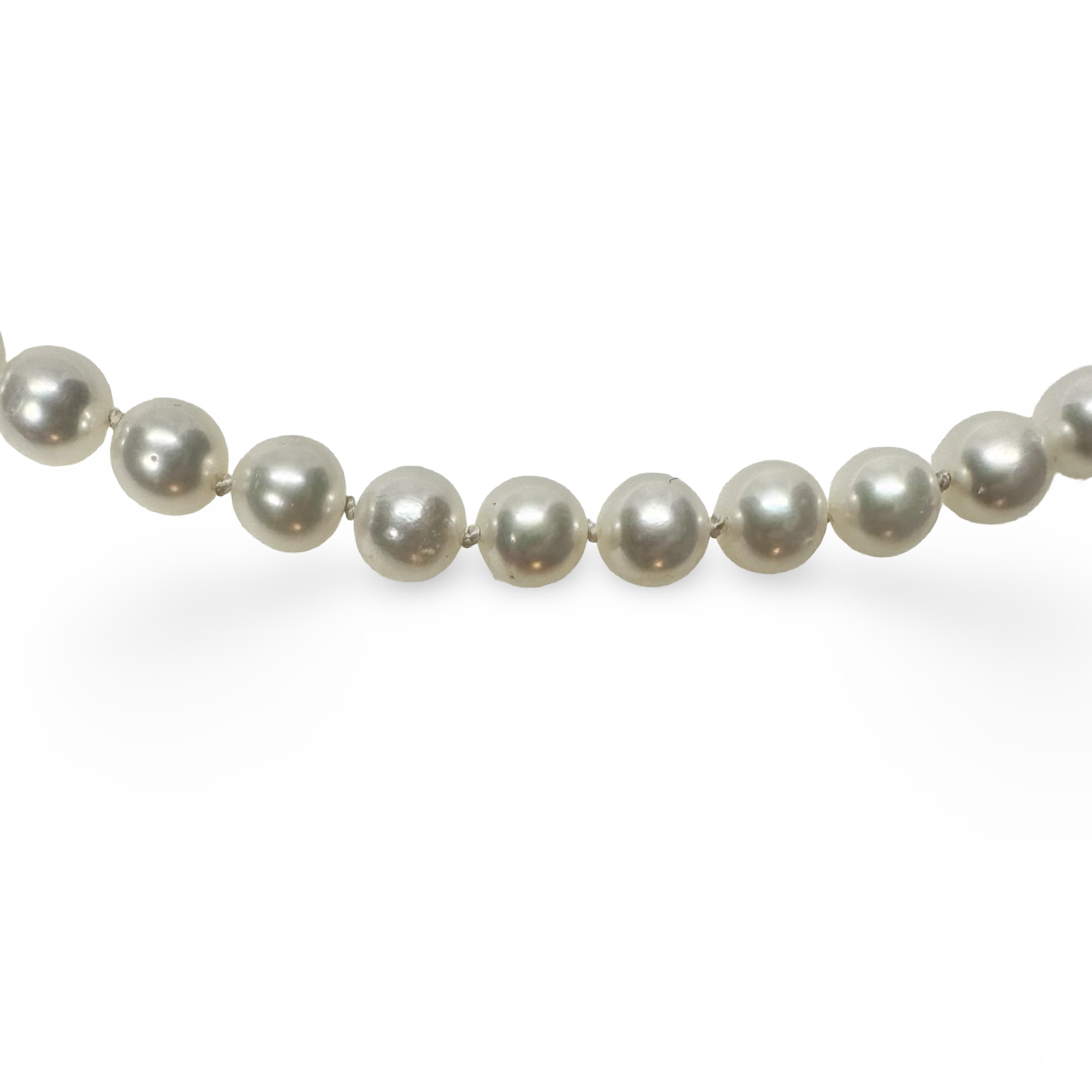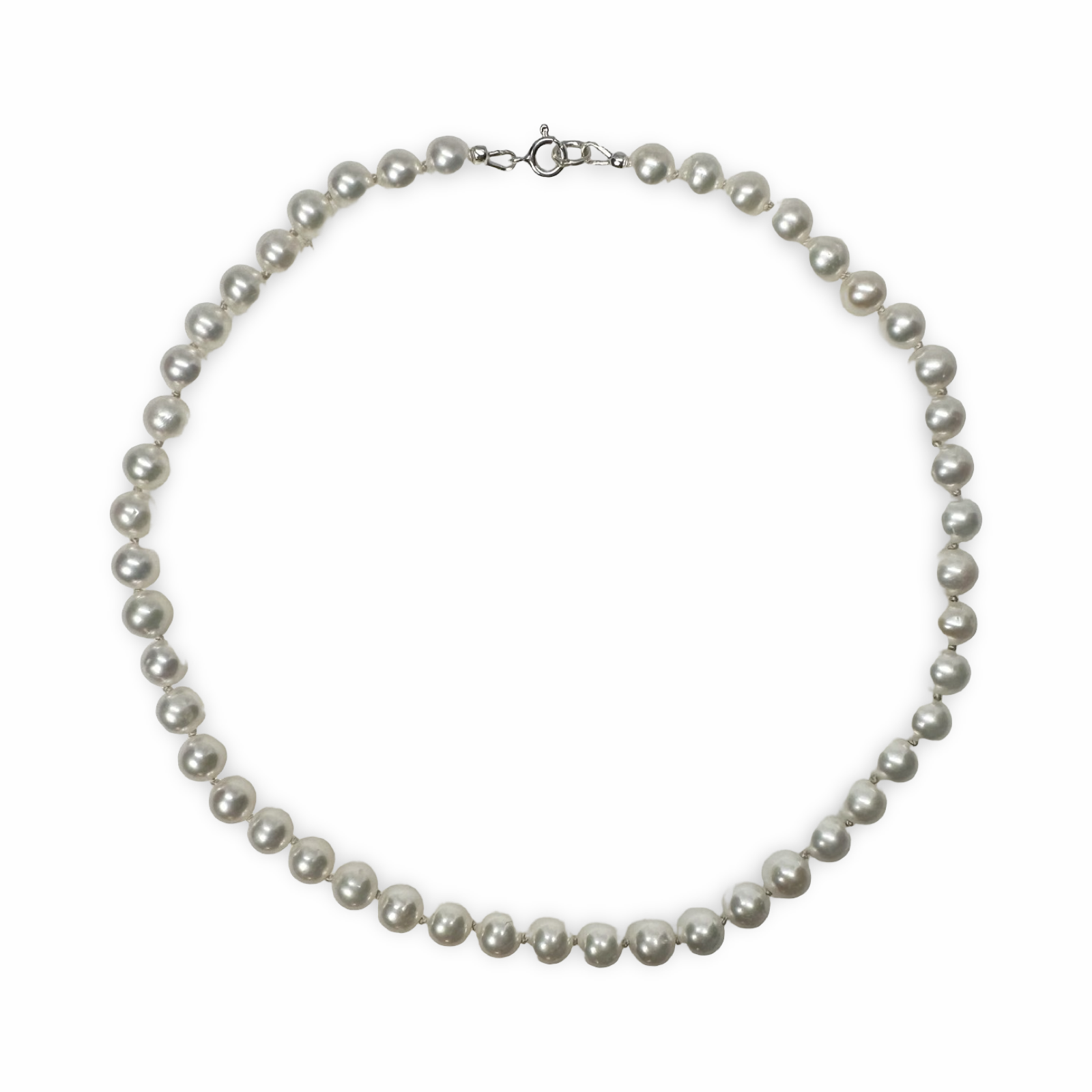 Kette aus Süsswasser-Perlen mit einem Durchmesser von ca. 7 mm. Die Halskette ist in drei Grössen erhältlich und wird mit einem Federverschluss aus Silber verschlossen. Sie wird im Atelier Tibet in Zürich handgefertigt.