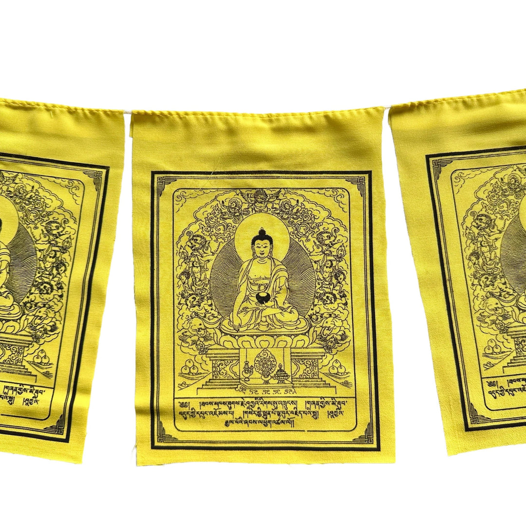 Yellow polyester prayer flags strung on a cord. Motif: "Medicine Buddha". 10 pieces. Made in Nepal.