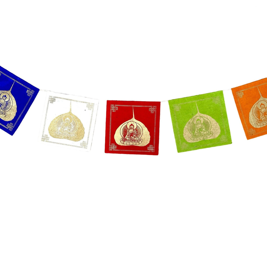 25 small prayer flags strung on a cord made of handmade Himalayan Lokta paper with the motif of the Medicine Buddha on a Bodhi leaf, which has been hand-printed with a wooden block. Each flag measures approx. 10 x 10 cm. Made in Nepal.