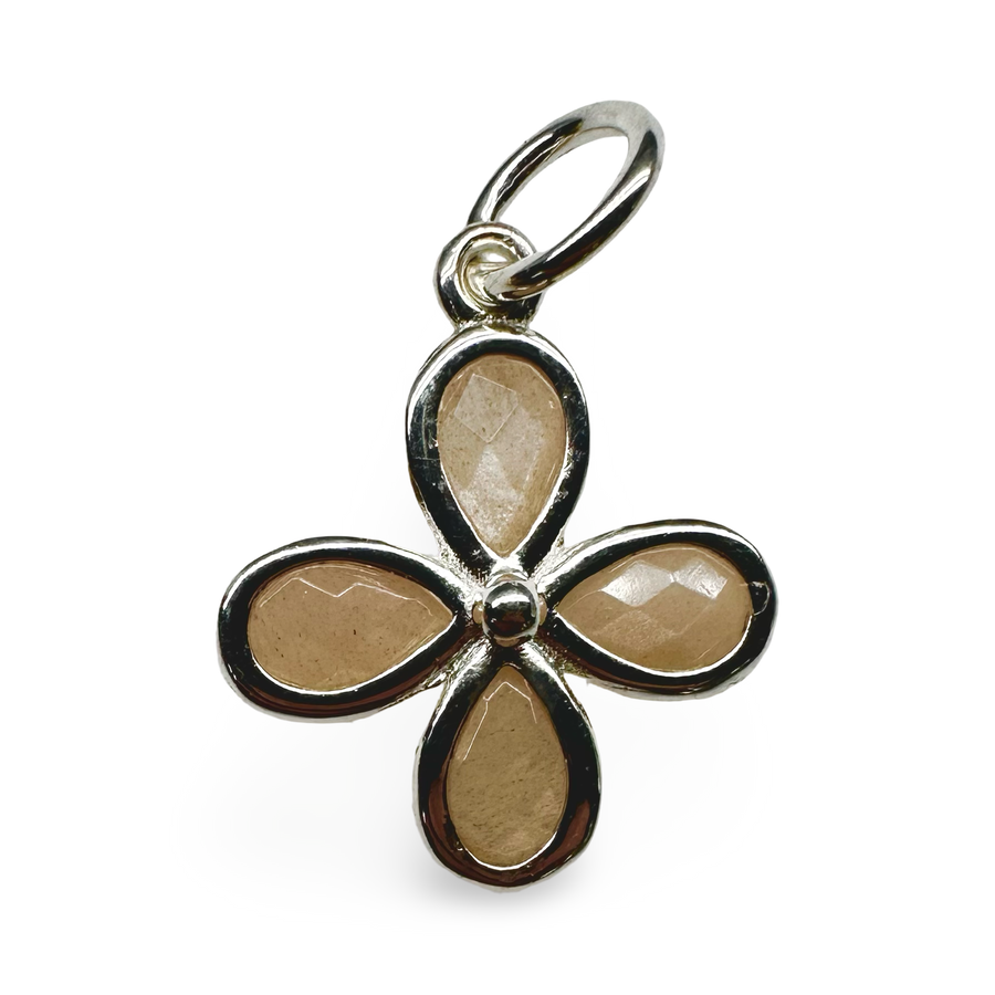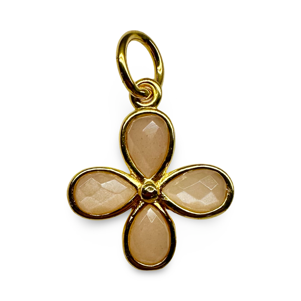 Pendant made of four drop-shaped pale pink shimmering "orange" moonstones set in silver or gold-plated silver, with an eyelet that allows it to be attached to a variety of chains available from Atelier Tibet. The pendant measures 1.7 cm in diameter and the eyelet has an inner diameter of 5 mm.