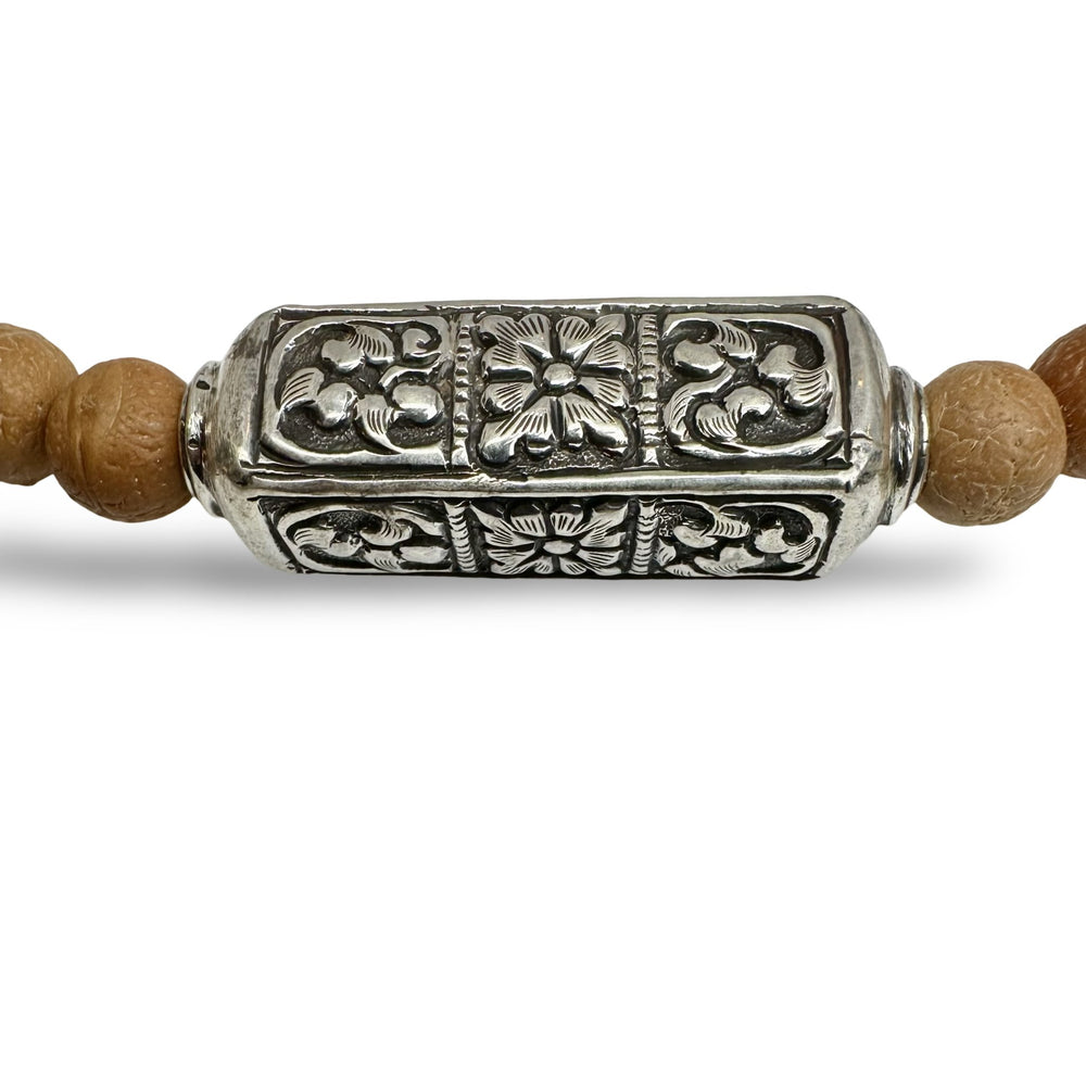 Necklace made from Bodhi seeds with a diameter of approx. 10 mm and a large, angular silver bead with Tibetan motifs, hand-forged in a traditional silversmith's workshop in Nepal. The circumference is 62 cm Handmade in Zurich in the Atelier Tibet.