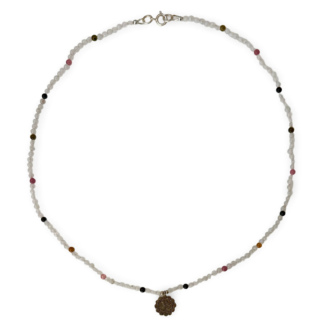 Necklace made of moonstone beads (⌀ 3 mm) interspersed with colorful tourmaline beads, with a lotus pendant and a silver spring clasp. Circumference 46 cm. Handmade in Zurich at Atelier Tibet.