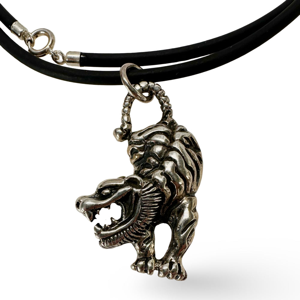 Large silver pendant depicting a tiger (42 x 26 mm) with an eyelet attached to its tail, on a black cord with a circumference of 59 cm. Handmade in a traditional Tibetan silver workshop in Nepal.