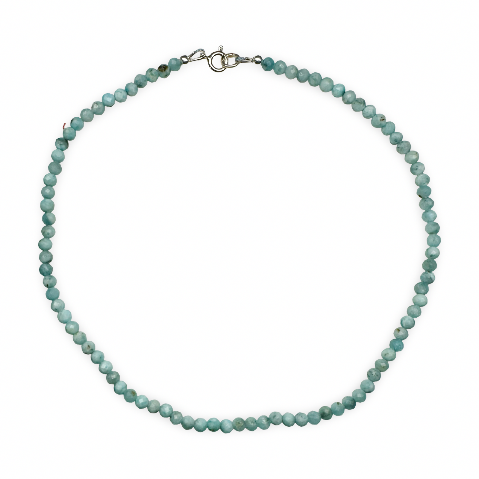 Child-size necklace with faceted Larimar beads and a silver spring clasp. The diameter of the beads is approx. 5 mm, the circumference of the necklace approx. 34 cm. The necklace is made in Atelier Tibet in Zurich.