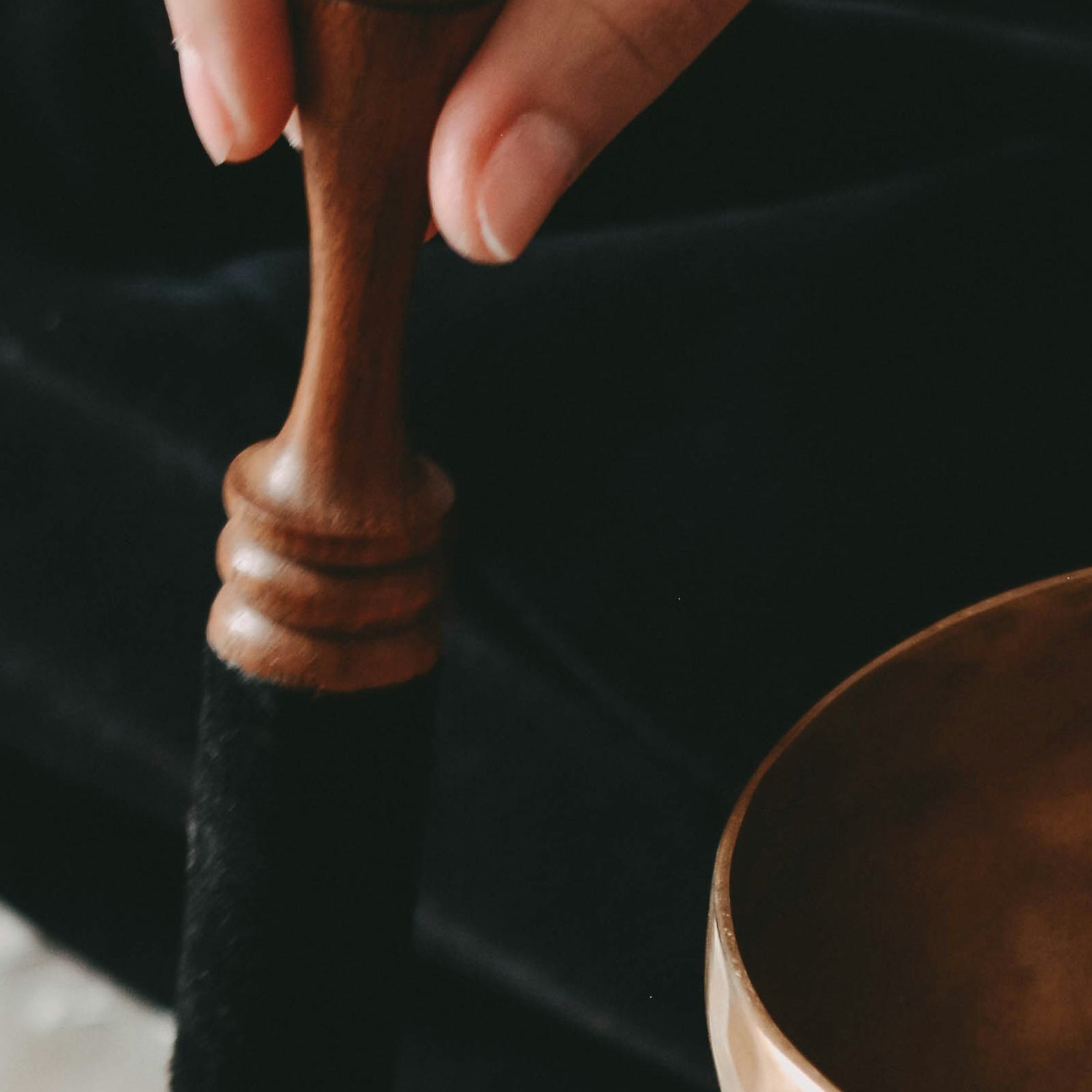 There are different ways to make a singing bowl sound. If you strike it gently with a felt or leather mallet, a clear and direct sound is produced. Alternatively, a leather-covered rubbing stick can be rubbed along the bowl to produce a sustained, vibrating sound. If a little water is added to the bowl, the sound changes and fascinating patterns are created.