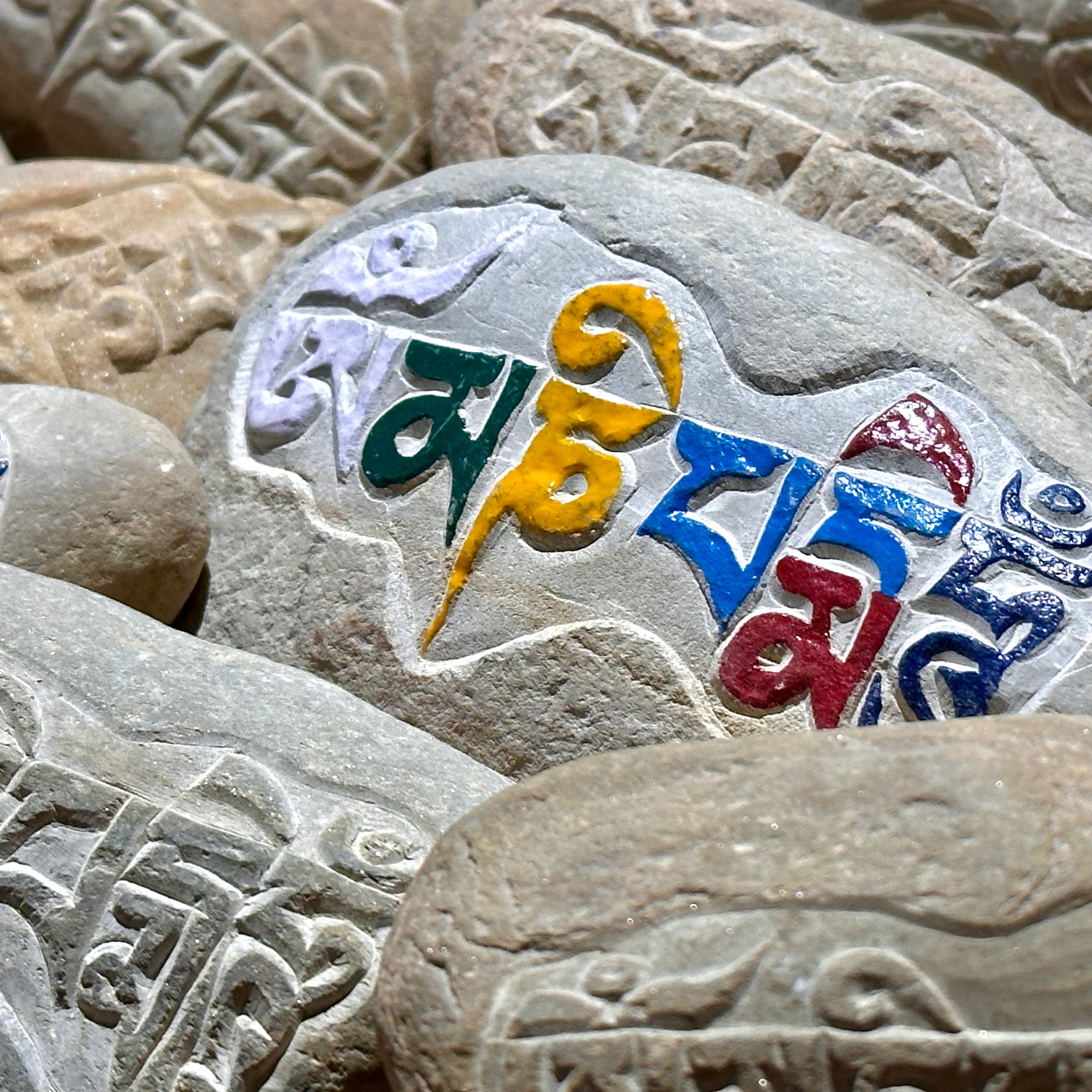 In the Himalayas, the colorful stones can be found on paths, walls, hills and in Tibetan monasteries. They were offered as sacrifices to the spirits of the place. Our mani stones are produced in a traditional workshop in Nepal, where chiseling and painting the stones is considered a traditional sadhana of piety.