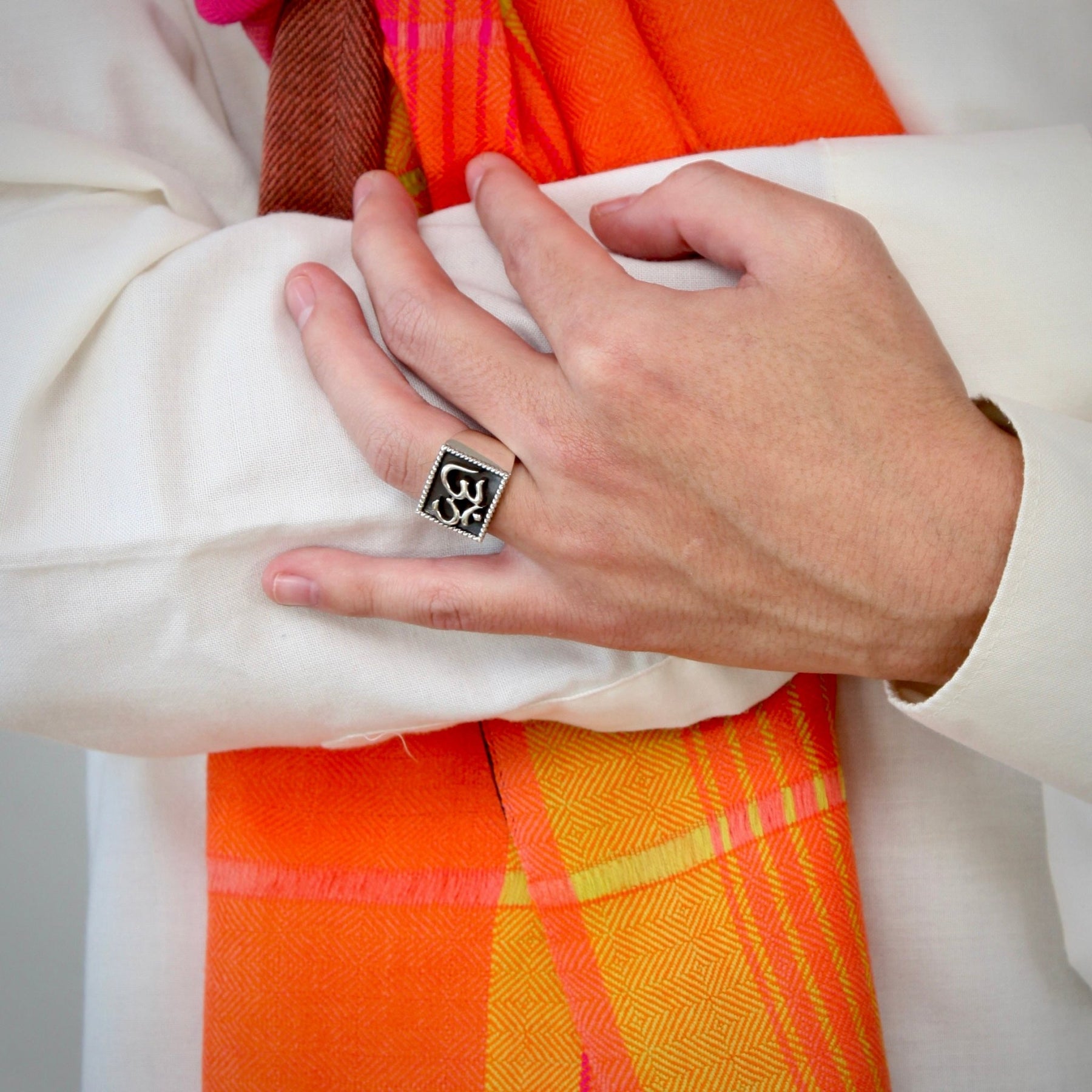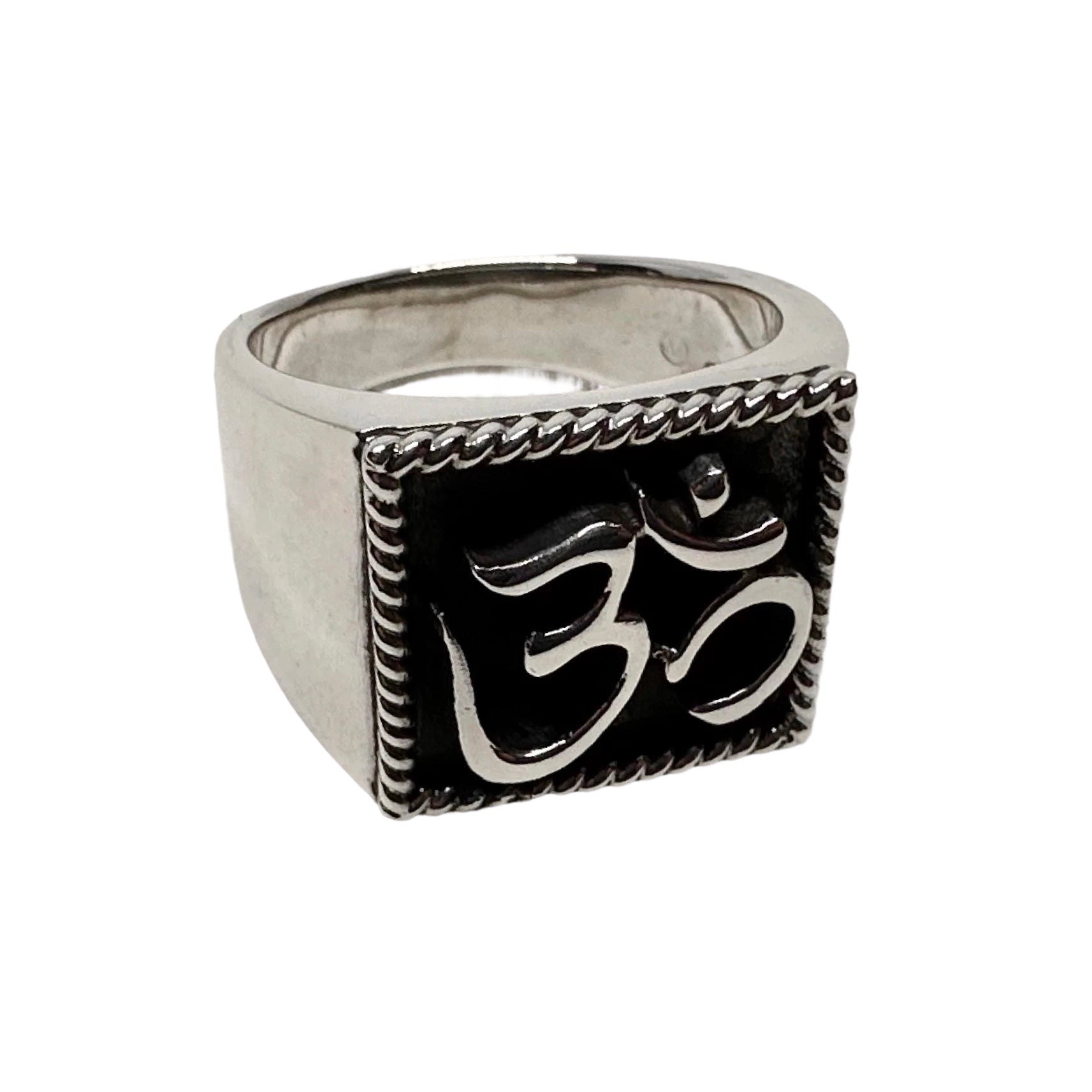 Solid silver ring with an "Om" ॐ on a square, blackened background (approx. 16 x 16 mm). Handmade in India. Available in various sizes.