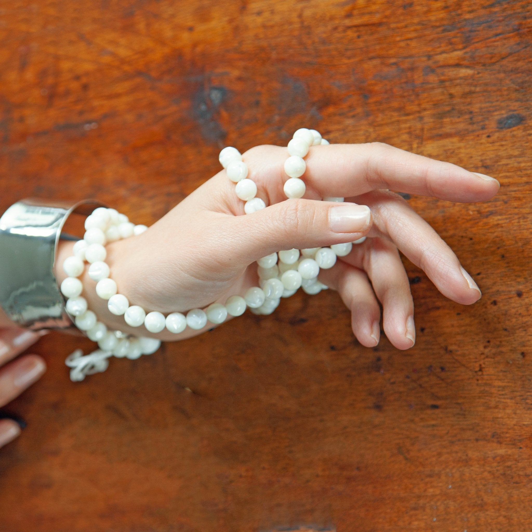 Mother-of-pearl prayer beads stand for purity, protection and spiritual renewal. Their shimmering surface reflects light and symbolizes clarity and harmony. They are often used for prayers that focus on compassion and love. Mother-of-pearl promotes emotional healing and balance. These malas are elegant and have a gentle, calming radiance.