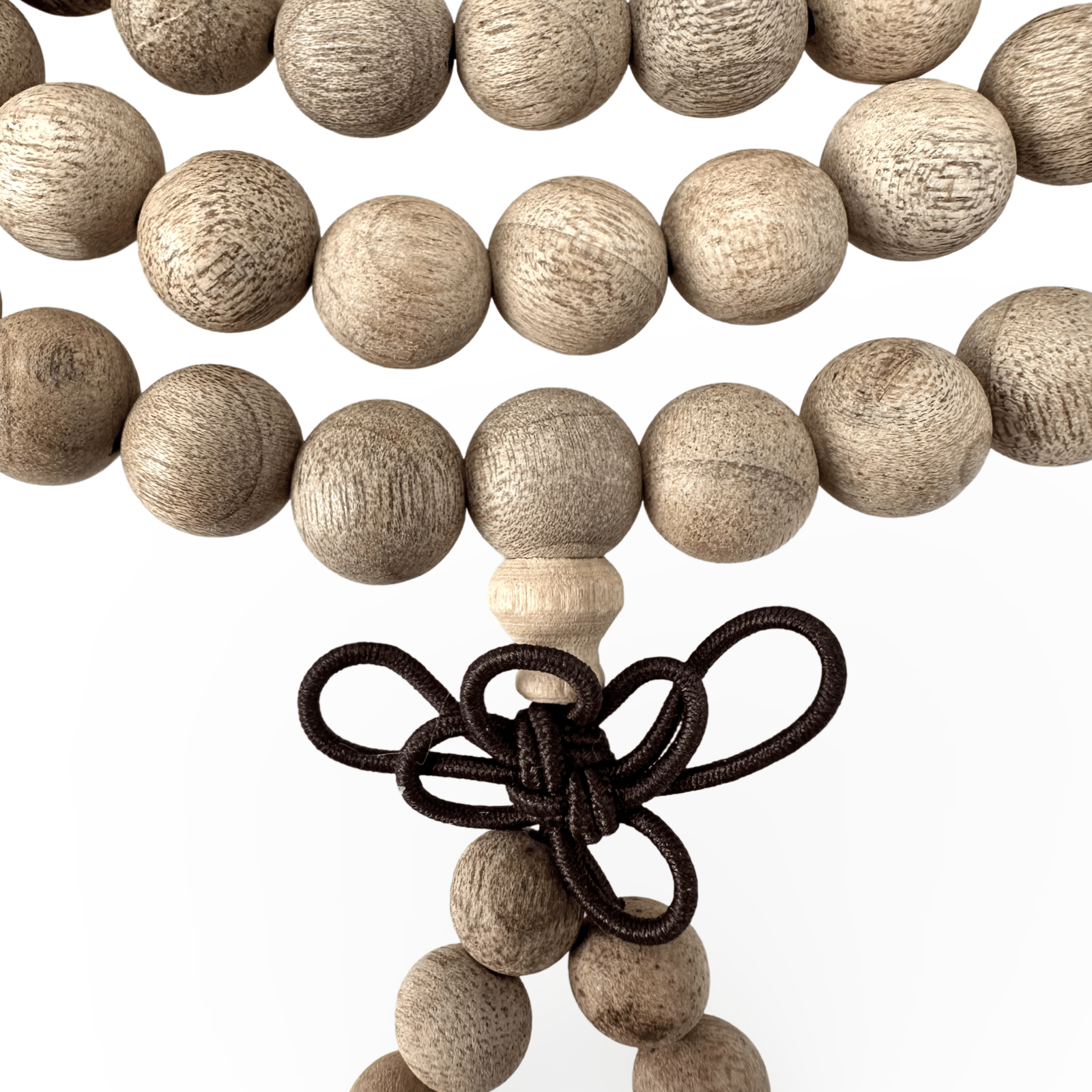 Prayer necklace with light, matt rosewood beads. The mala is strung on a brown, elastic cord and is therefore particularly suitable for wearing around the wrist. There is a lucky knot at the bottom and six decorative beads as a harmonious finish. The mala measures approx. 83 cm in circumference and the diameter of the wooden beads is 8 mm.