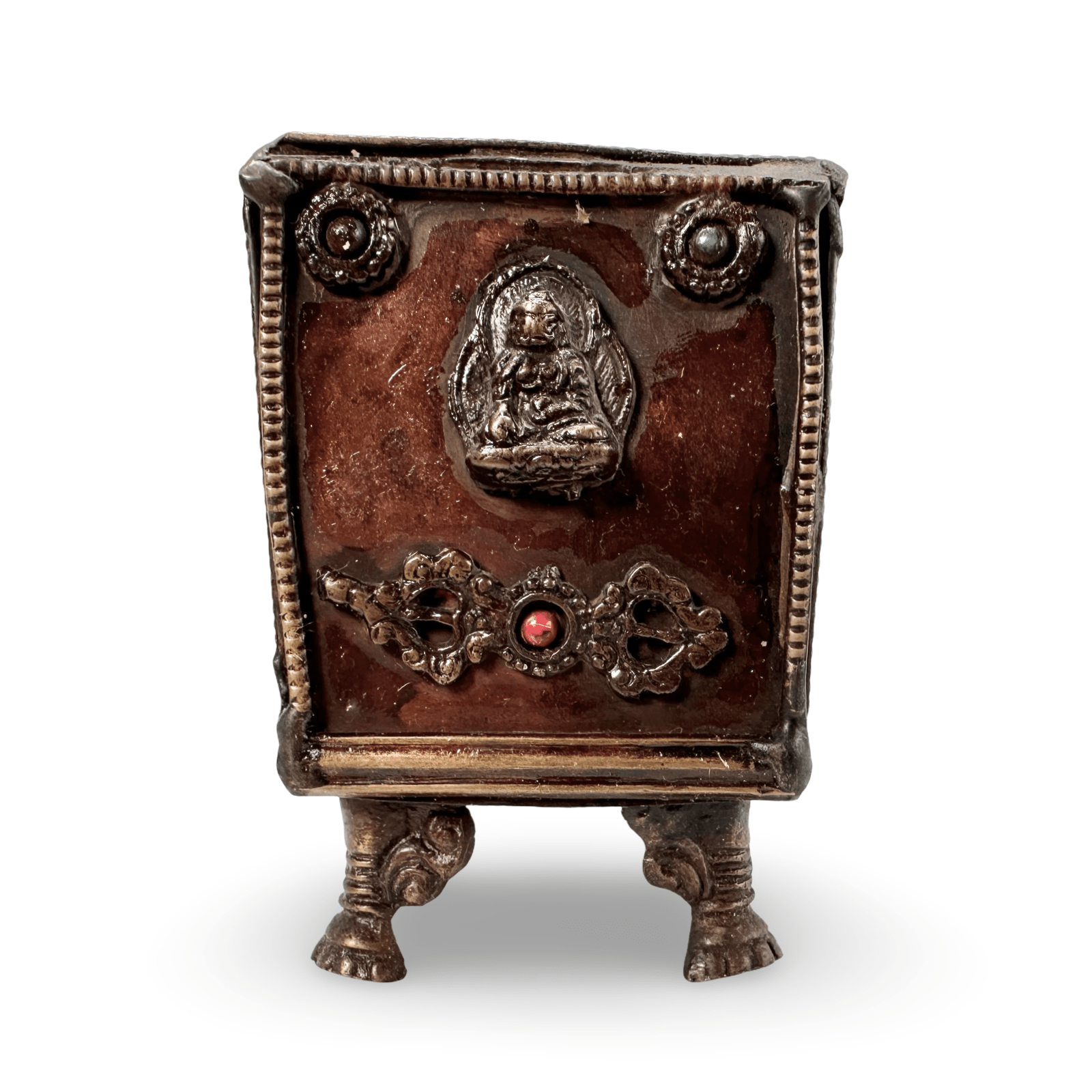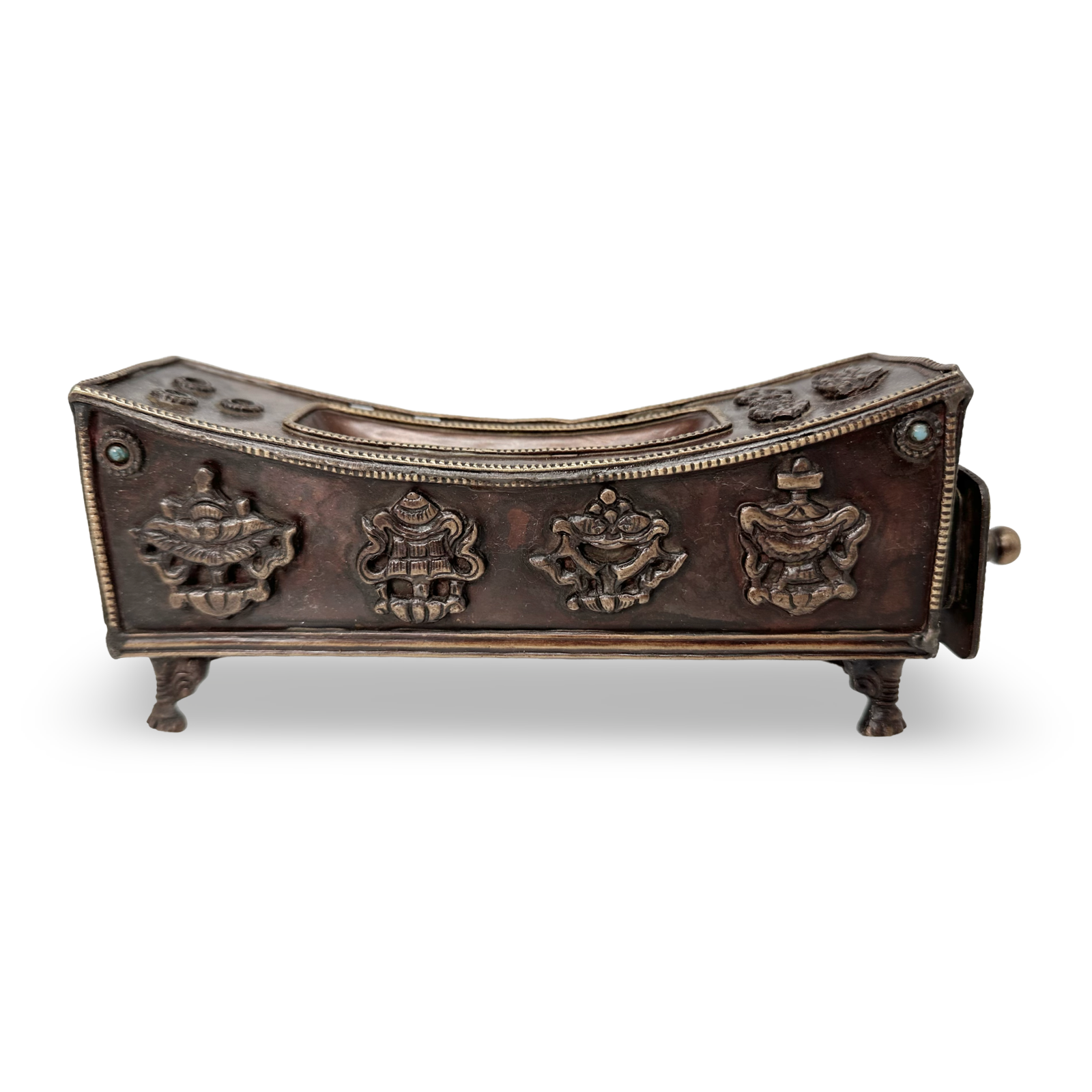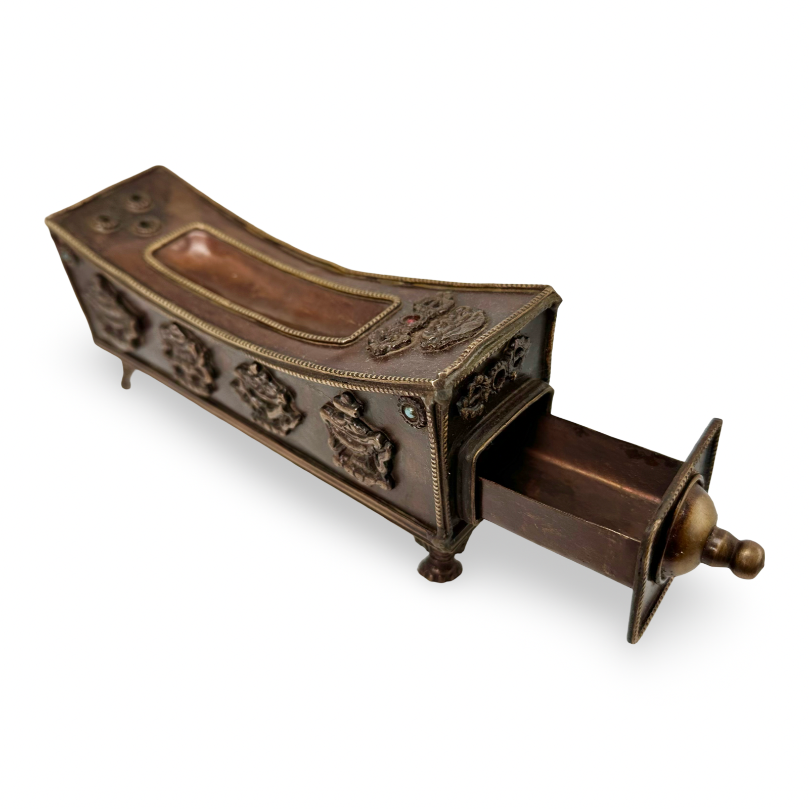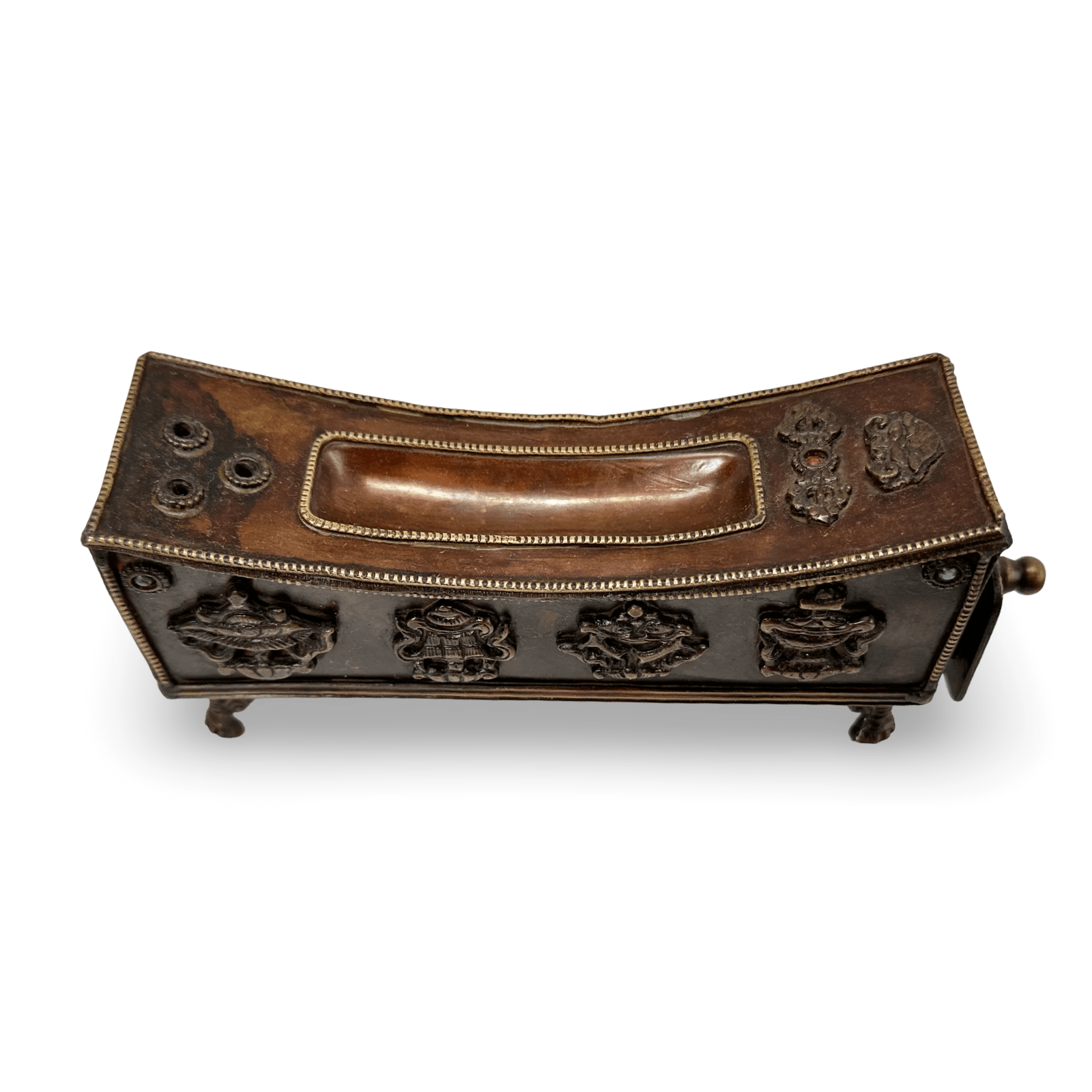 Ce brûle-encens tibétain est en métal et richement orné de motifs en relief. De forme rectangulaire, il repose sur quatre petits pieds, ce qui lui confère une allure stable et compacte. Des symboles tibétains de bon augure sont représentés sur le devant, et une figure de Bouddha orne le côté.