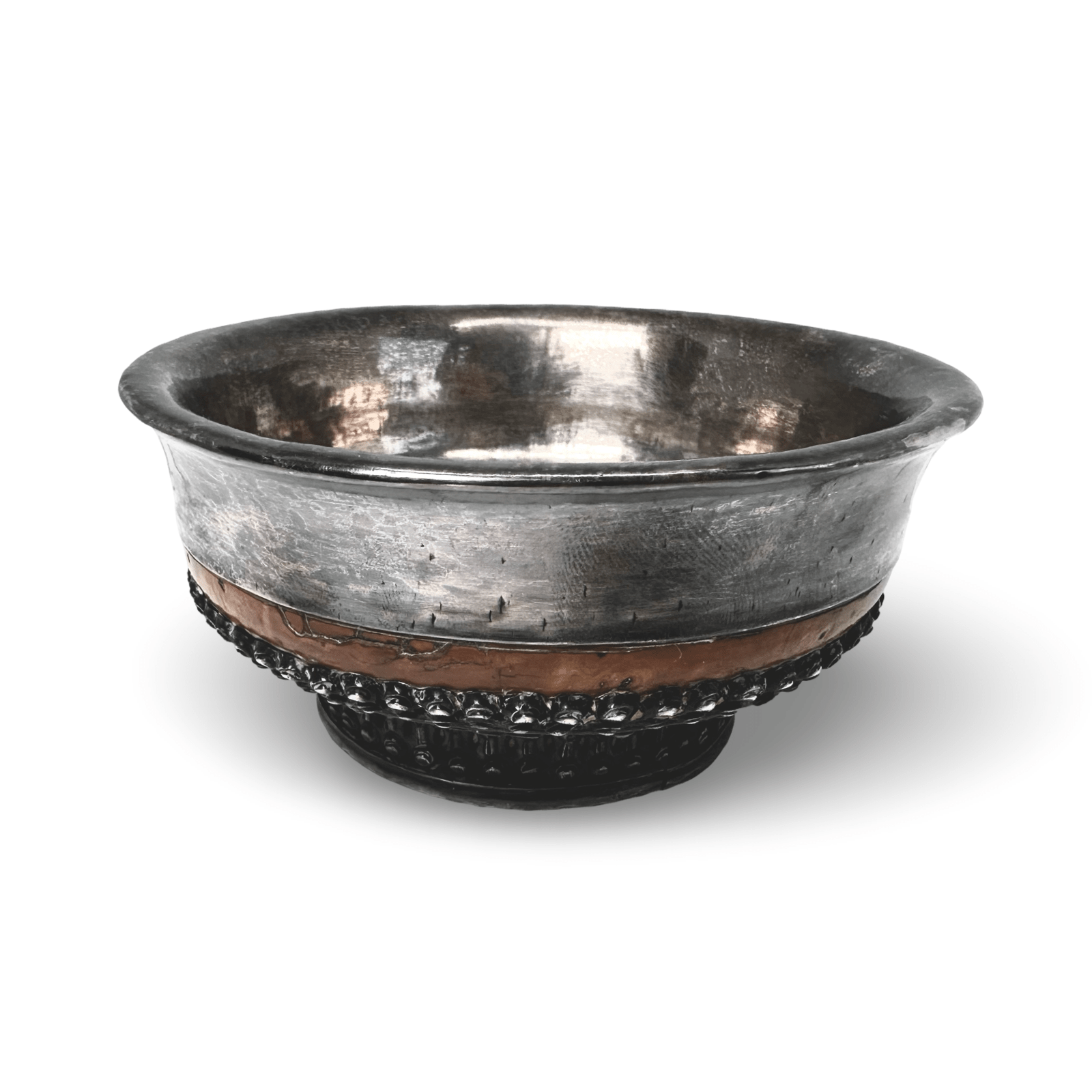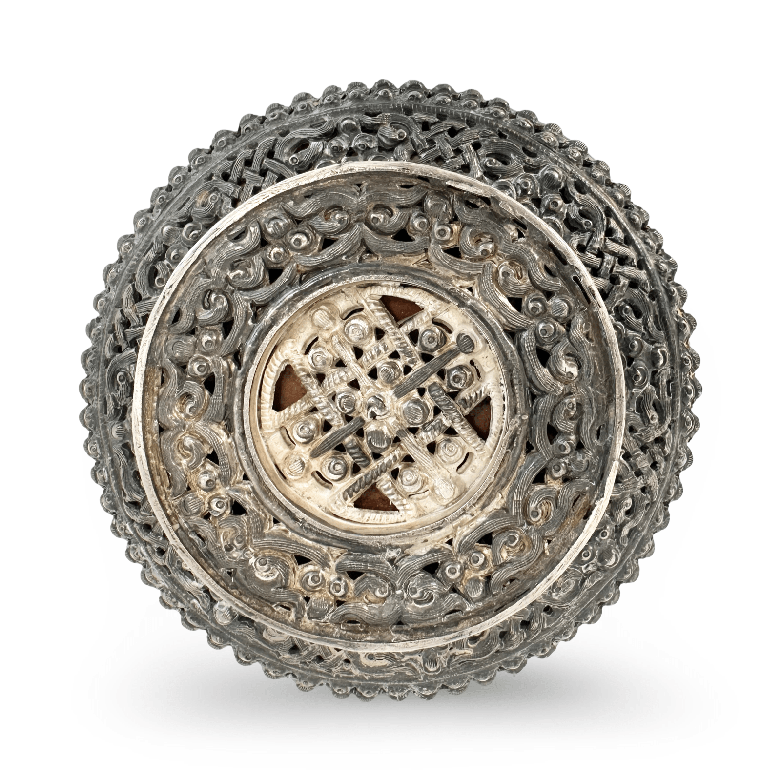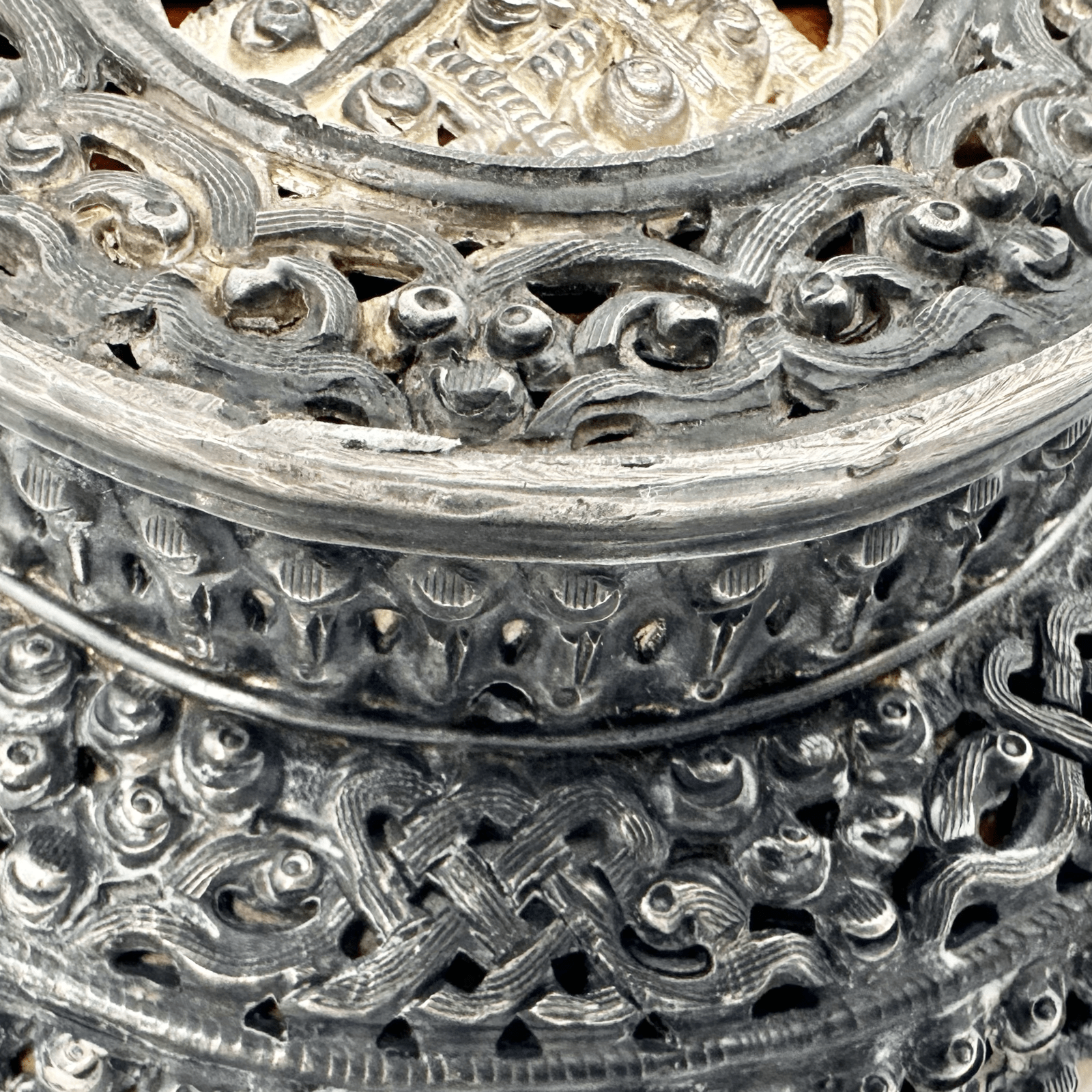 Le bol se compose d'une écuelle en bois tourné – polie à l'intérieur, avec une teinte de bois chaude et sombre – qui est recouverte à l'extérieur d'une monture élaborée en métal à haute teneur en argent. Sous le bord du bol, une large bande de bois exposée court comme une touche de couleur chaleureuse. Le pied est richement décoré de bandes circulaires – une bande de perles et une bande de rinceaux ajourés. Le fond, vu d'en bas, présente un nœud sans fin ajouré au centre, entouré de rinceaux de nuages – un signe de grande minutie artisanale, qui reste autrement cachée à la vue.