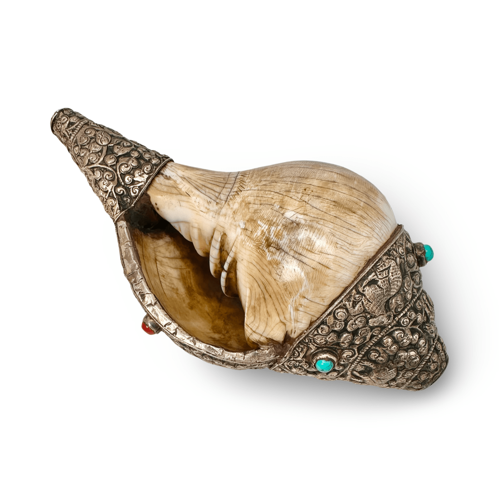 La monture en argent comprend un sertissage ciselé à l'apex avec un cabochon de corail, un embout richement décoré avec un médaillon central en turquoise, ainsi qu'un anneau en argent à la jonction entre le ventre et l'embout. Au dos de la conque, le sertissage en argent montre d'autres figures d'animaux repoussées – un éléphant reconnaissable ainsi que des rinceaux de nuages. Des cabochons de corail et de turquoise sont répartis sur la pièce.