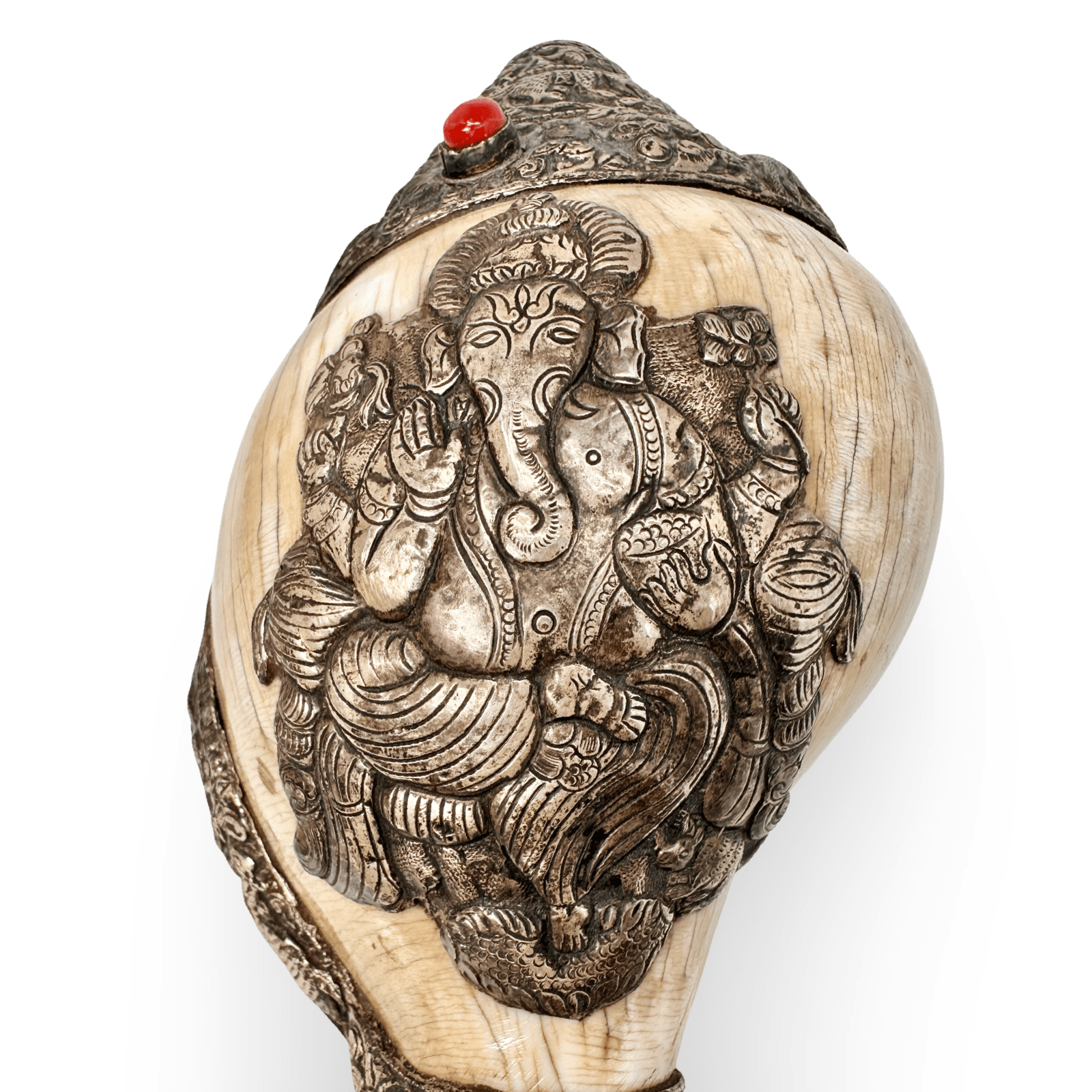 Trompette en conque tibétaine (Dungkar) avec monture partielle en argent et une représentation inhabituelle de Ganesh – probablement fin du 20e siècle, travail népalais.