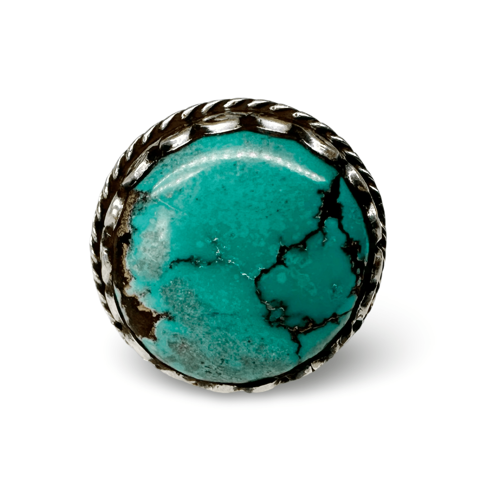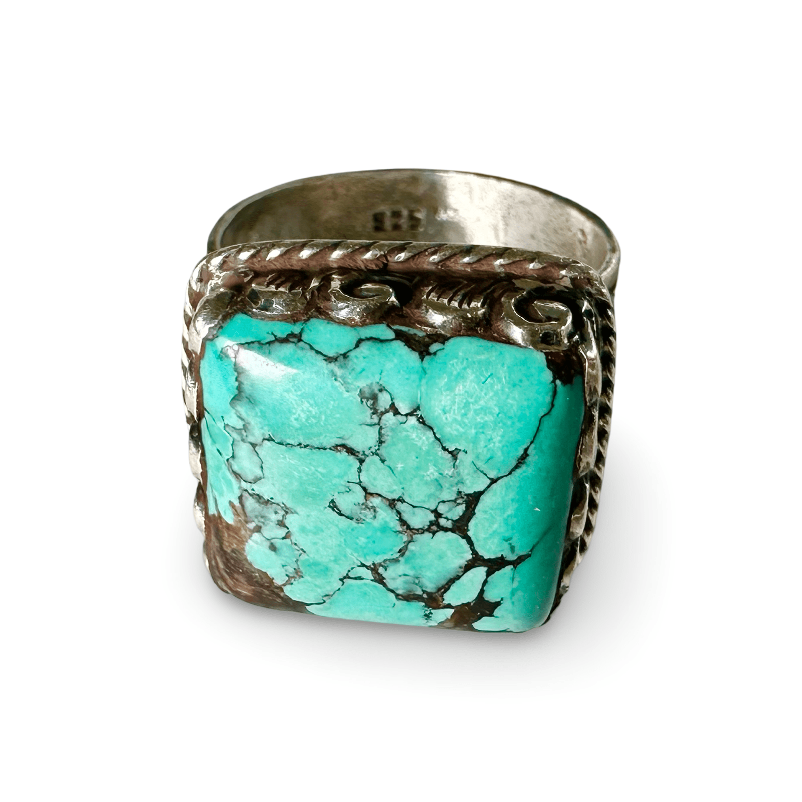 Bague traditionnelle tibétaine en argent ornée d'une grande turquoise, disponible en forme ronde ou carrée. L'anneau et le dos sont ciselés de motifs floraux tibétains. Chaque bague est unique, la couleur de la pierre et le décor en argent variant d'une pièce à l'autre.