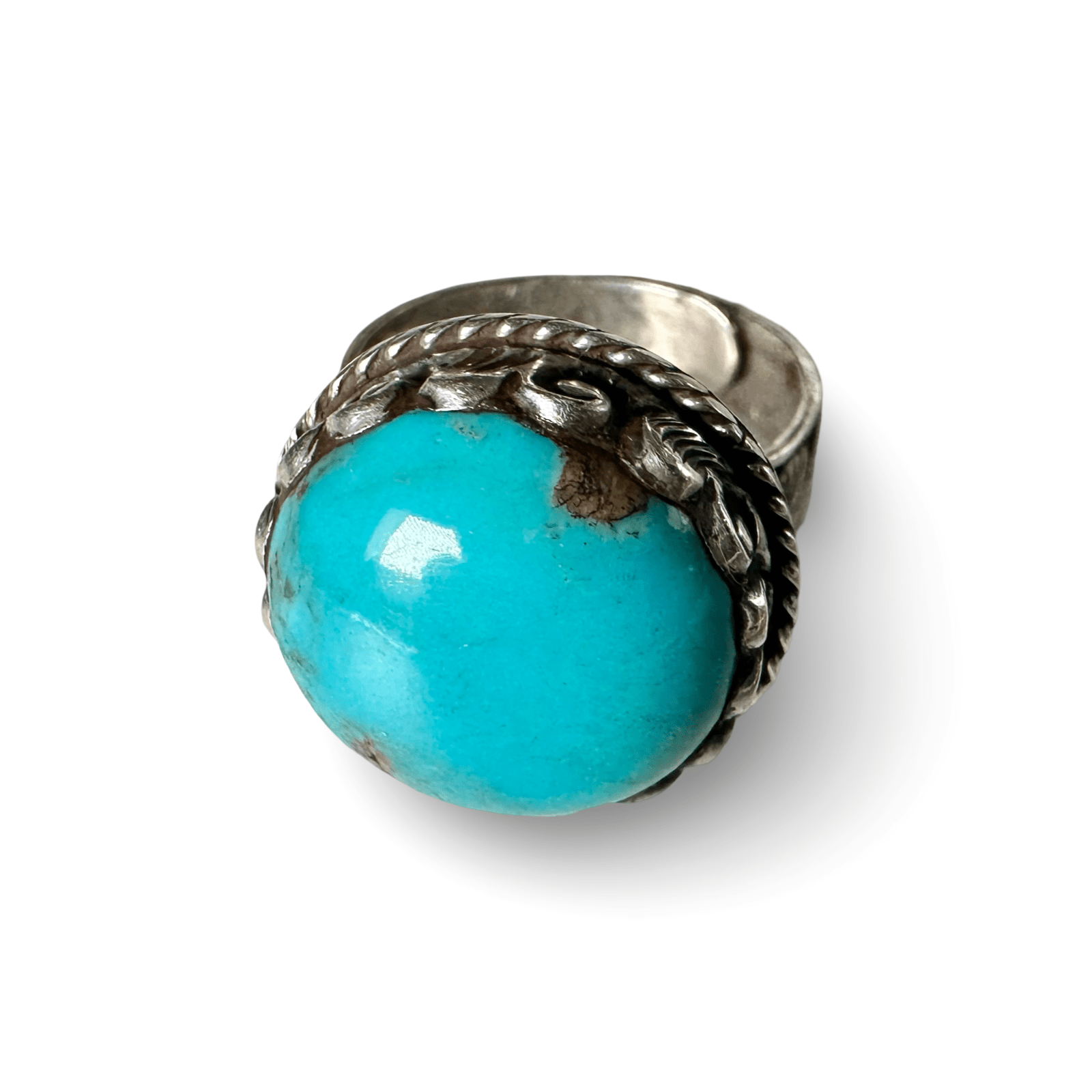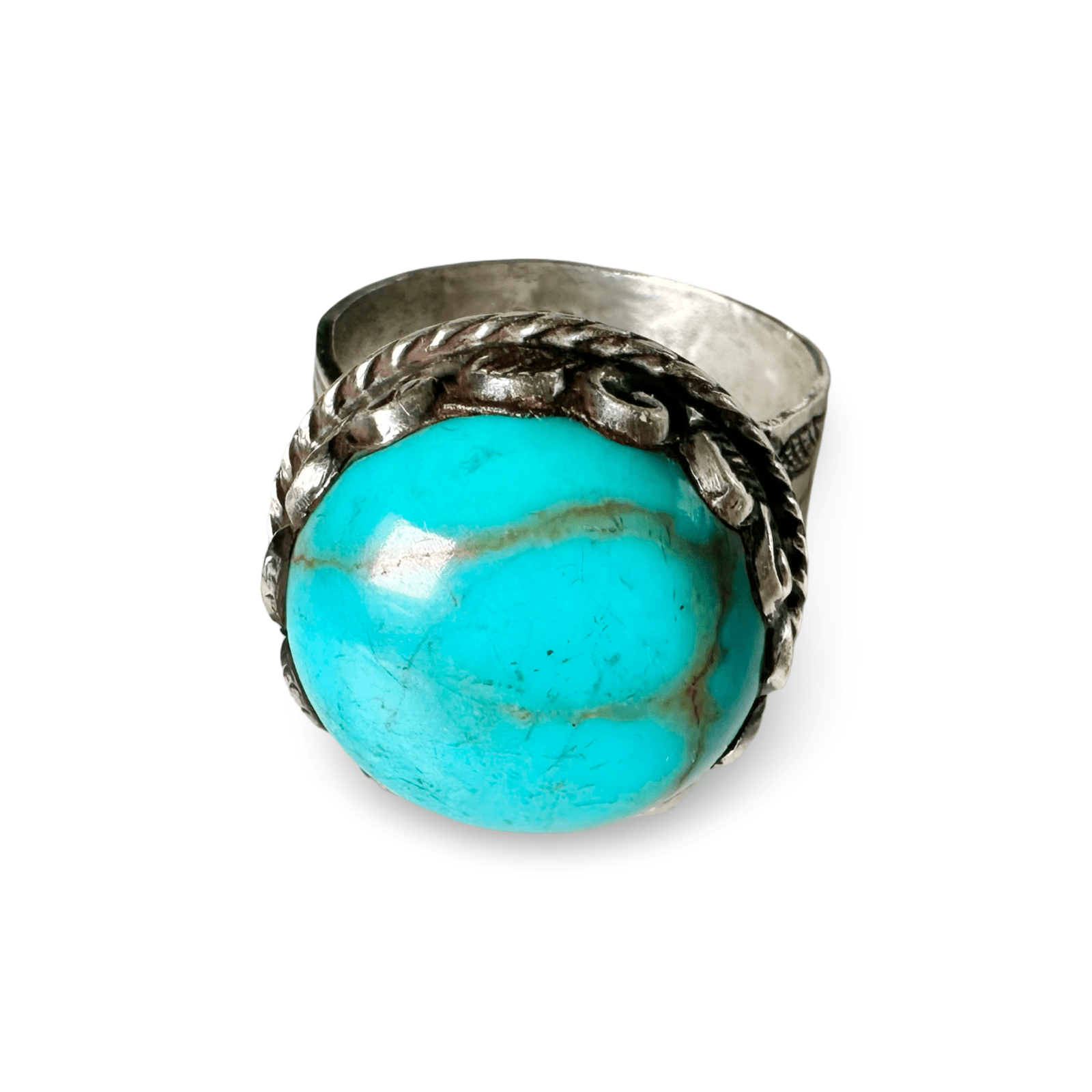 La pierre turquoise a un diamètre d'environ 18 à 20 mm. La bague est ajustable et peut être adaptée à différentes tailles de doigts.