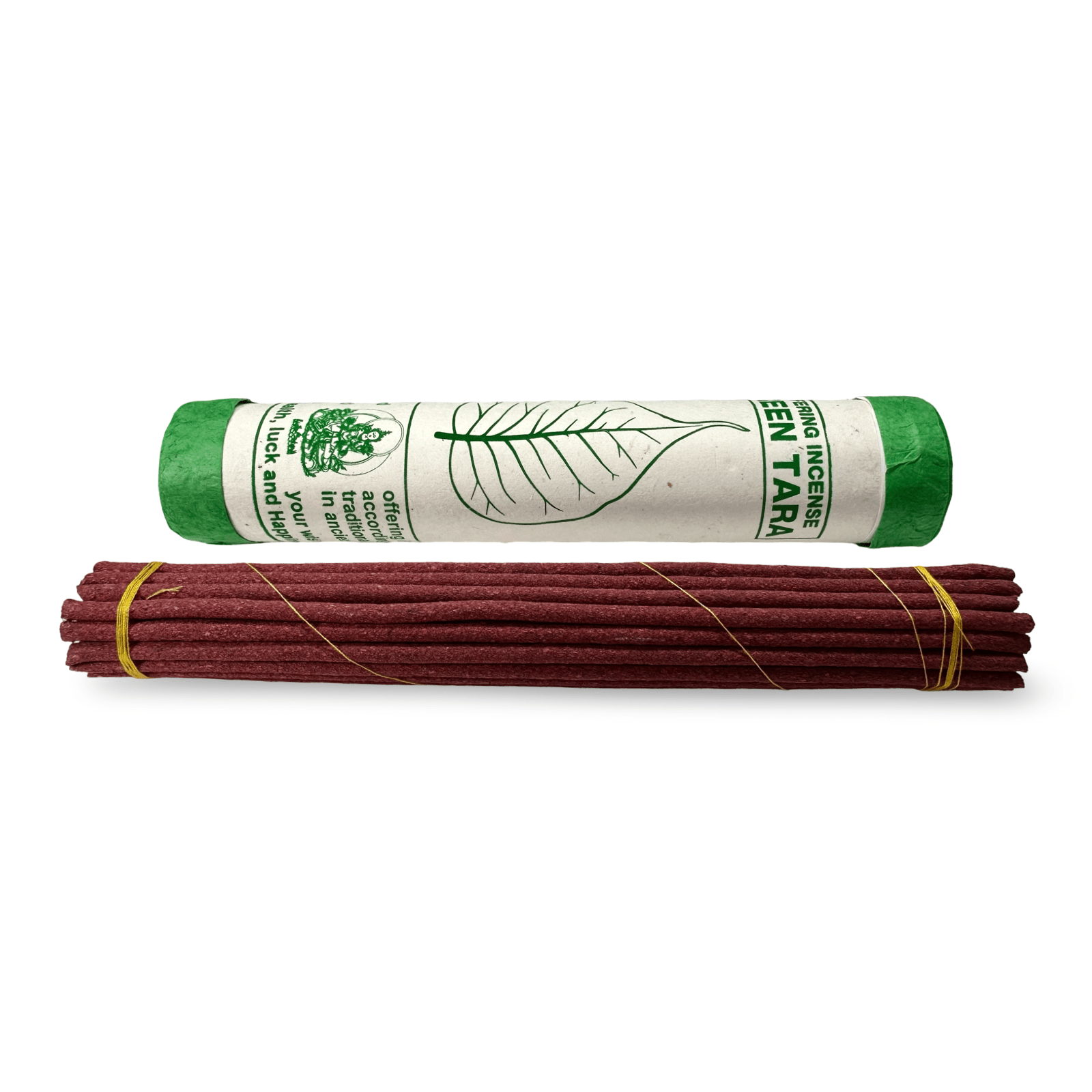 Les bâtonnets d'encens se présentent dans un rouleau de papier robuste orné d'un imprimé Tara vert, comme c'est généralement le cas pour l'encens Druk, et sont idéaux pour la méditation, les rituels de prière ou simplement pour harmoniser une pièce.