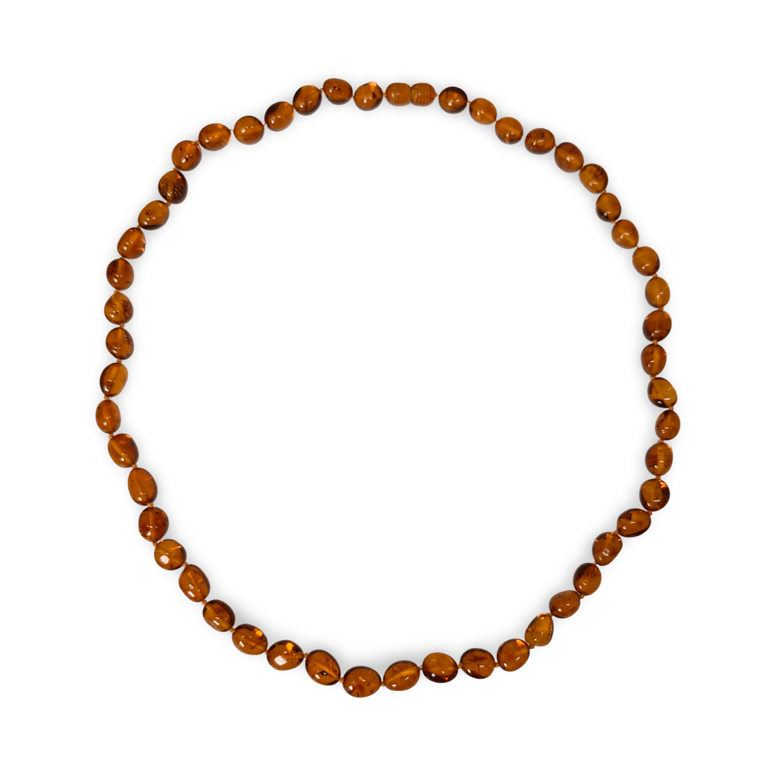 Collier composé de perles d'ambre polies couleur miel. Les perles ont un diamètre de 8 à 10 mm, une circonférence d'environ 57 cm et un fermoir discret composé de deux perles d'ambre vissées ensemble.