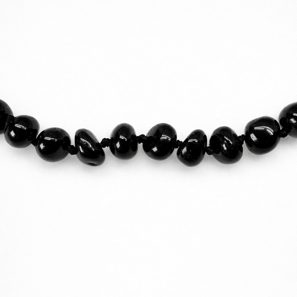 Un collier composé de perles d'ambre presque noires aux reflets rouge sang sous la lumière. Les perles mesurent environ 7 mm de diamètre, le collier a une circonférence d'environ 47 cm et se ferme discrètement par un fermoir formé de deux perles d'ambre vissées ensemble.