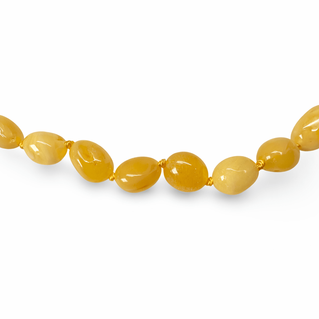 Petit collier pour tout-petits composé de perles d'ambre jaune clair en forme de haricot ( ⌀ 6 mm). La circonférence est d'environ 32 cm. Le collier possède un fermoir composé de deux perles d'ambre vissées ensemble.