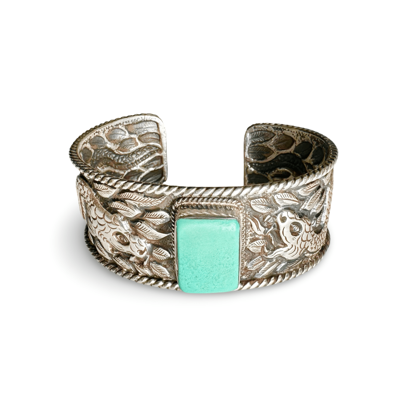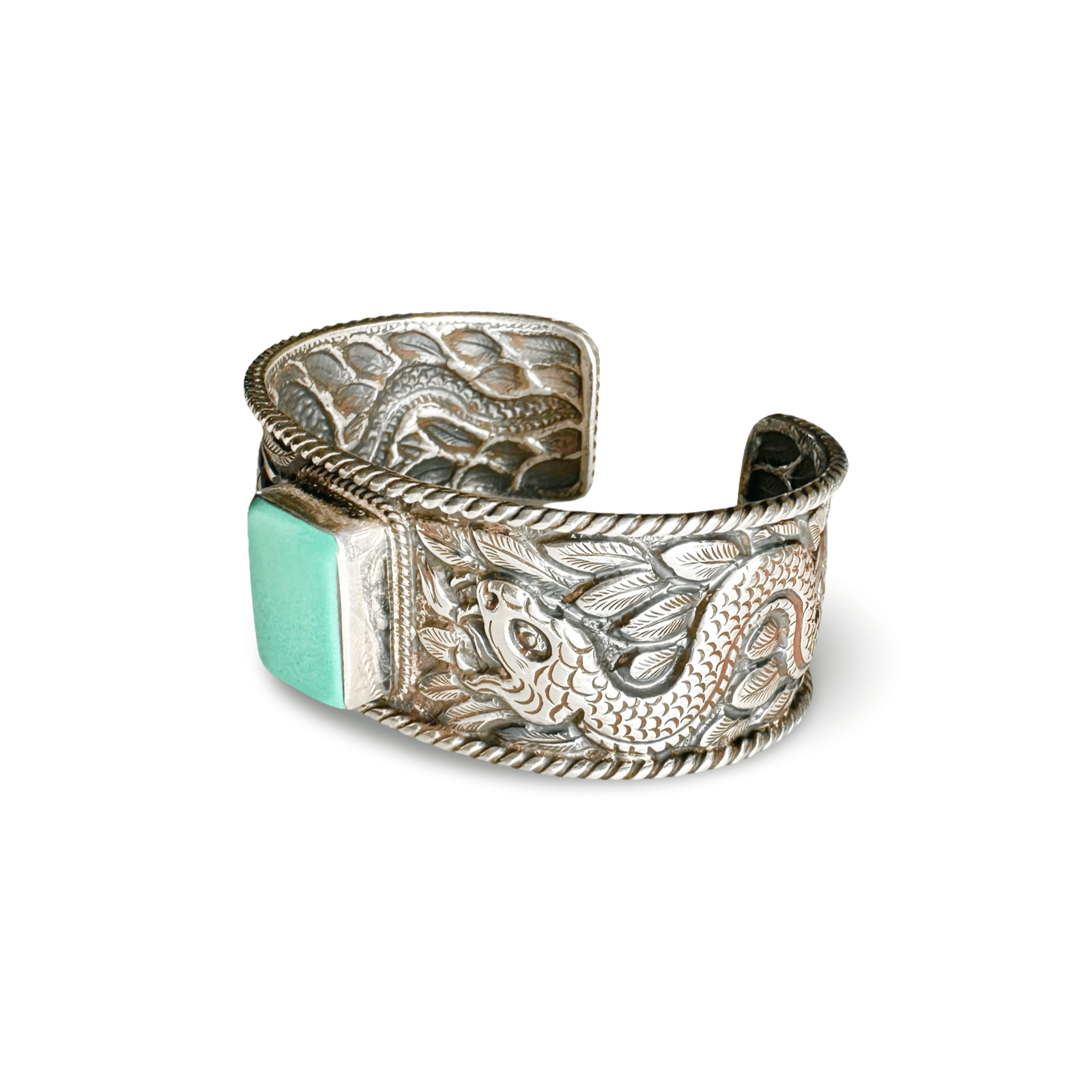 Le relief environnant montre un serpent détaillé des deux côtés, qui s'enroule de manière dynamique sur le bracelet jusqu'à la pierre turquoise rectangulaire, qui est sertie au milieu du devant.