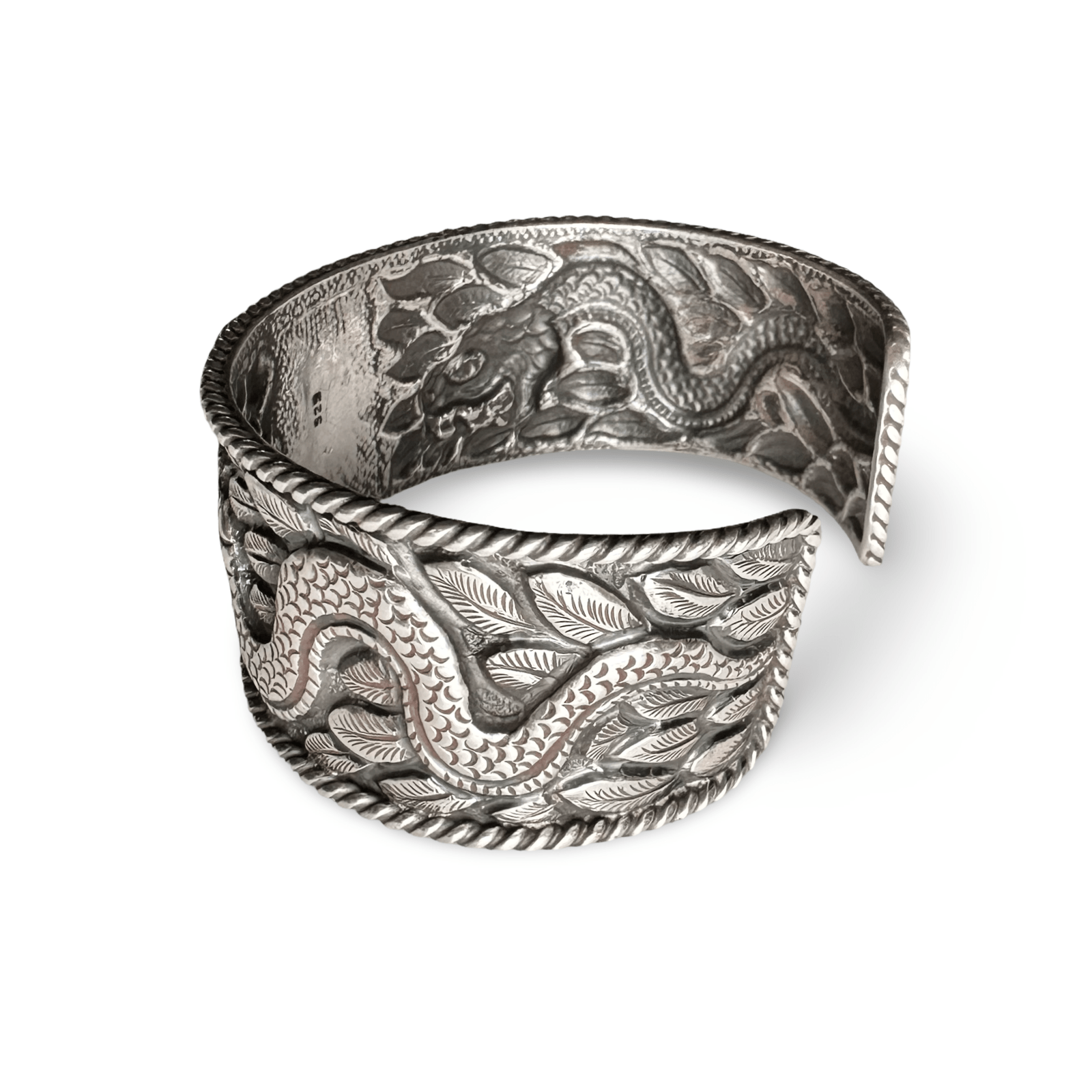 Ce bracelet tibétain exceptionnel a été réalisé en exclusivité pour l'Année du Serpent de Bois par un orfèvre traditionnel du Népal. Réalisé en argent massif, il mesure 26 mm de large et allie une gravure magistrale à un symbolisme puissant.