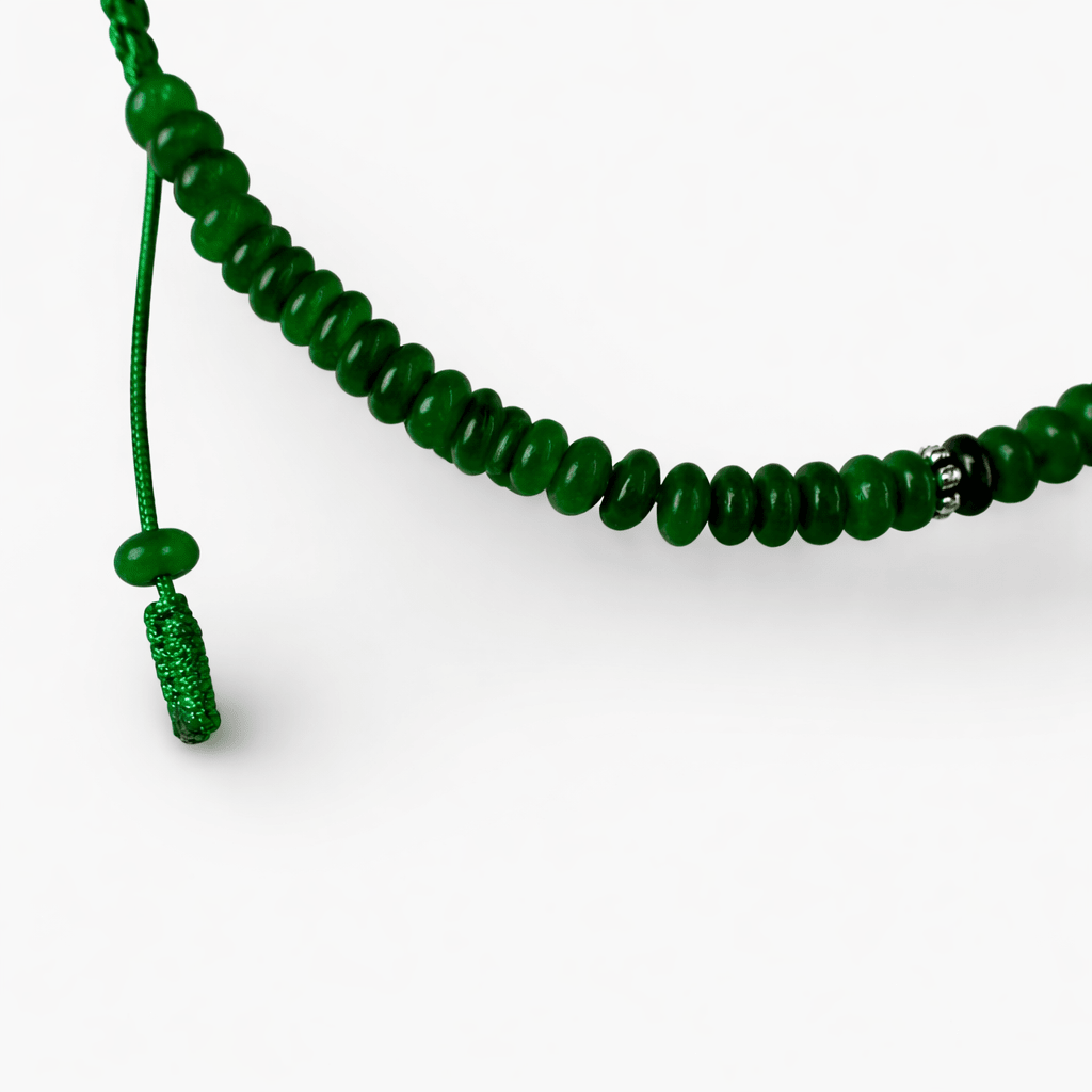 Le fermoir macramé ajustable en cordon vert s'adapte avec souplesse à la cheville et repose en toute sécurité sur le pied. La chaîne est fabriquée à la main dans l'atelier Tibet à Zurich.