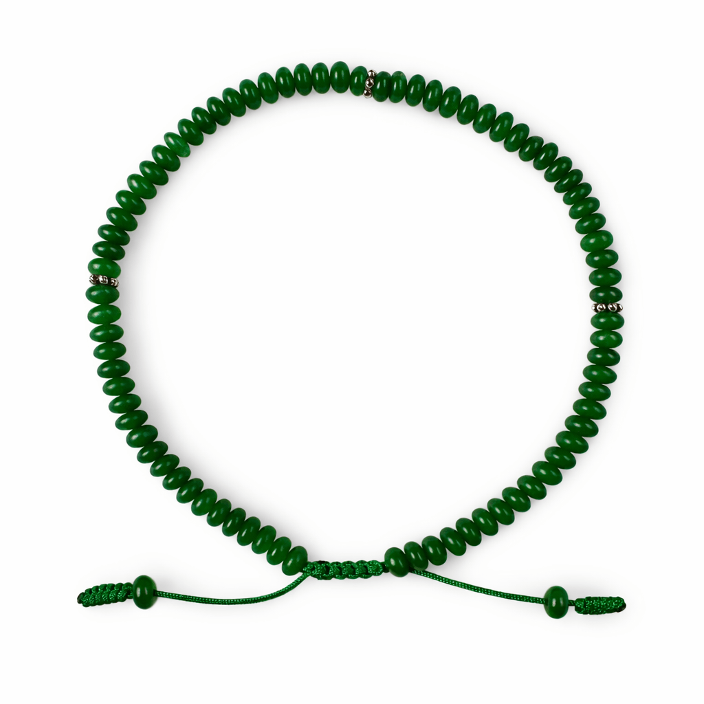 Cette chaîne de cheville en aventurine verte naturelle est fabriquée à la main dans notre atelier à Zurich. Les perles plates en forme de disque sont étroitement espacées pour former un bandeau dense et régulier — interrompu par de fines perles d'espacement en argent qui apportent des accents discrets.