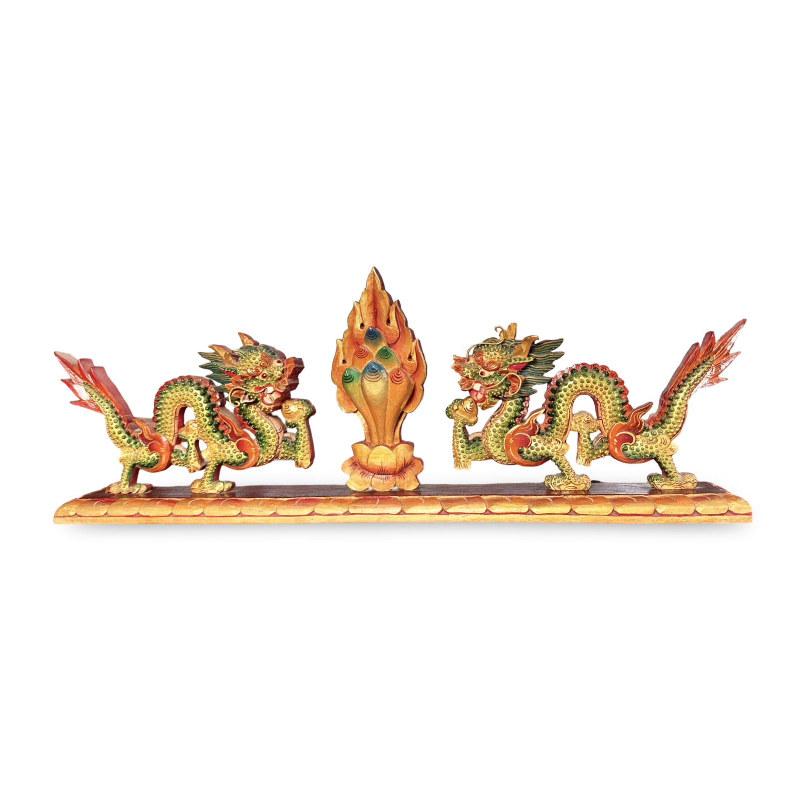 La représentation met en scène deux puissants dragons Chepu encadrant une flamme centrale ou un motif de joyau. Dans la région himalayenne, les dragons Chepu sont considérés comme des êtres protecteurs et les gardiens des lieux sacrés. Ils symbolisent la force, la vigilance, la protection spirituelle et le lien entre les éléments. Leur posture dynamique, la finesse de leurs écailles et les couleurs vibrantes, dans les tons or, vert et rouge, confèrent à la statue une présence et une expressivité saisissantes.