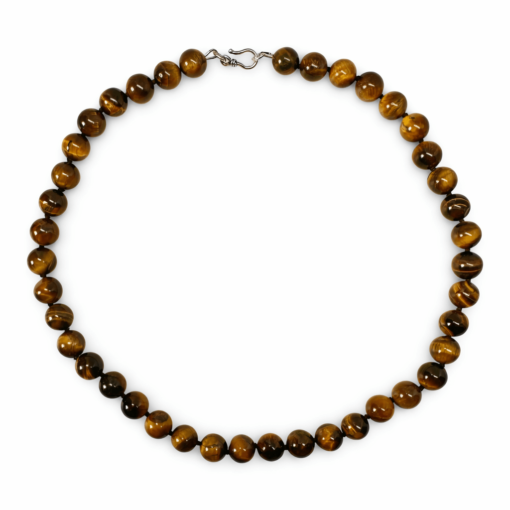 L'œil de tigre est une pierre protectrice aux reflets chatoyants, traditionnellement prisée pour sa capacité à favoriser la clarté, la concentration et la force intérieure . On dit qu'elle encourage la prise de décision, confère du courage et équilibre l'esprit et les émotions. Ses chaudes nuances dorées et brunes confèrent au collier une élégance naturelle et authentique.