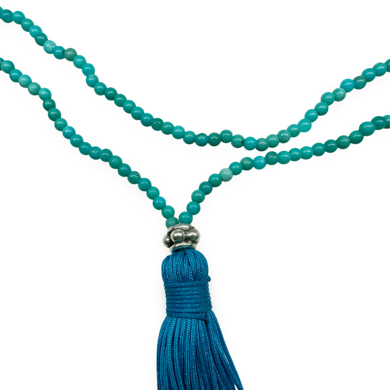Collier long et délicat composé de perles de turquoise de 2 mm de diamètre, orné d'un pompon turquoise et d'une perle en argent. Ce collier mesure 70 cm de circonférence. Il est fabriqué à la main dans l'Atelier Tibet à Zurich.