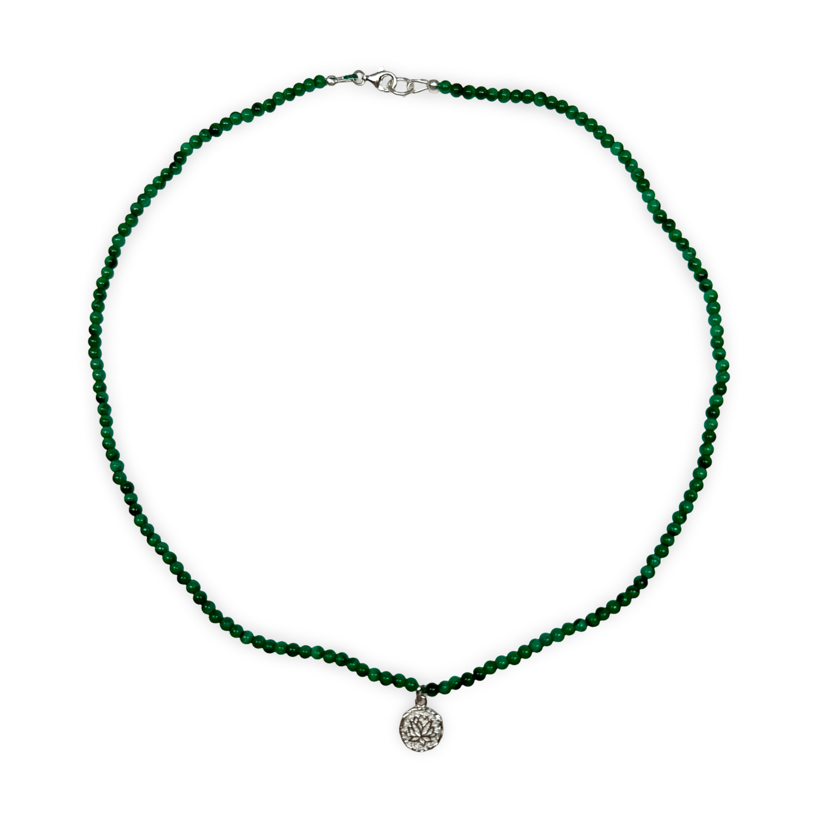 Un collier délicat composé de perles de malachite polies aux reflets vert-noir, avec un fermoir à ressort en argent. Il est orné d'un pendentif rond en argent orné d'une fleur de lotus stylisée.