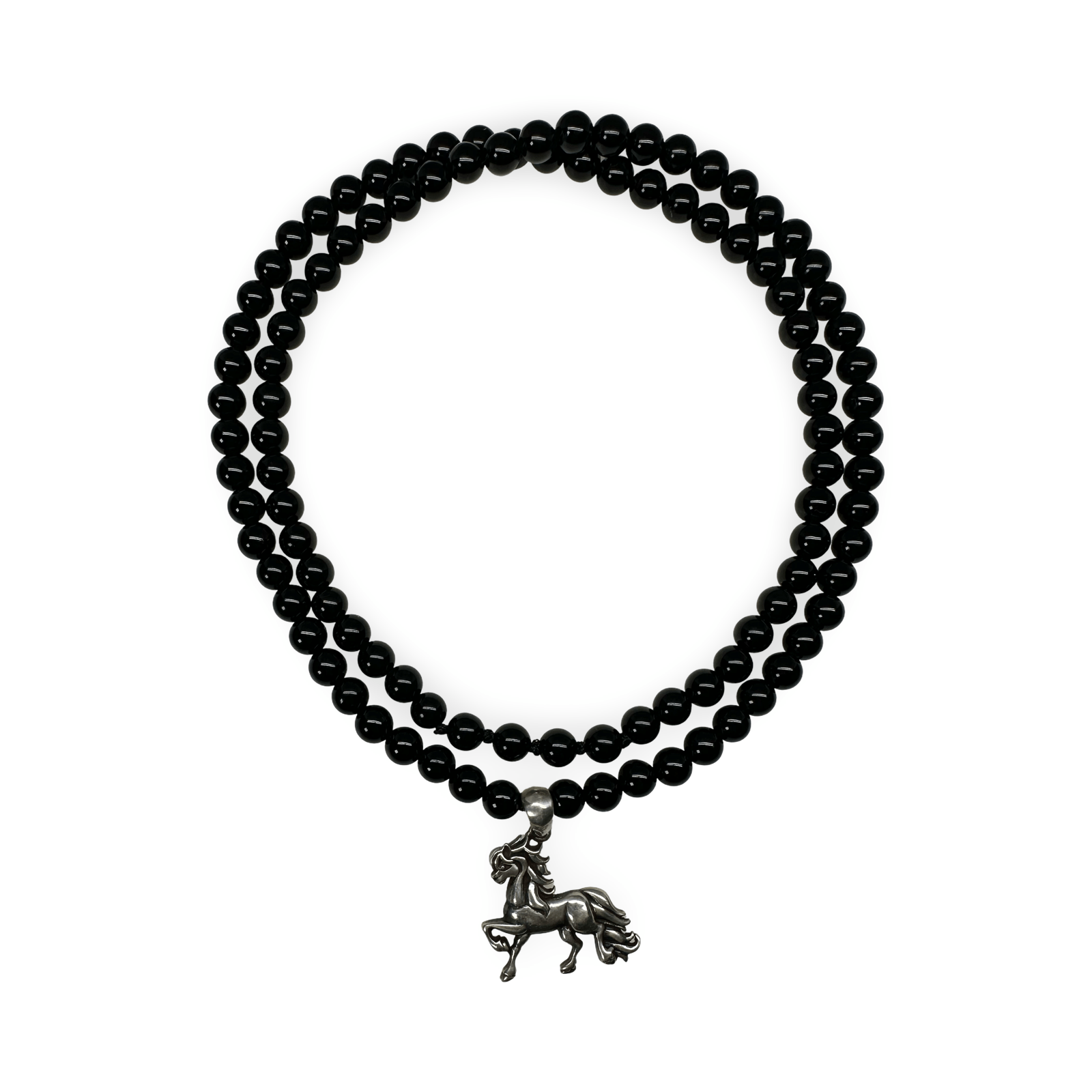 Long collier composé de perles d'onyx noir brillant d'un diamètre de 6 mm ; un pendentif en forme de cheval en argent y est attaché.