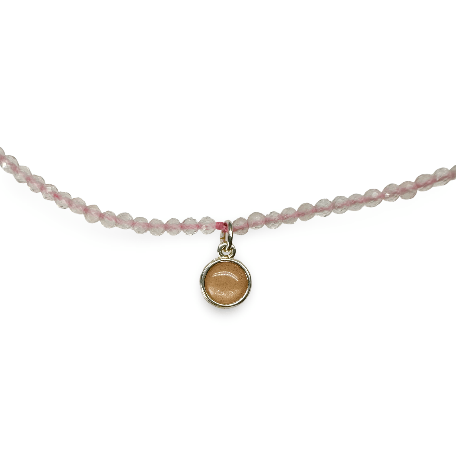 Collier composé de perles de quartz rose de 3 mm enfilées sur un cordon rose. Une pierre de lune ronde, sertie d'argent, y est attachée. Le collier se ferme par un fermoir à ressort en argent et mesure 40 cm de circonférence. Fabriqué artisanalement dans l'atelier Tibet à Zurich.